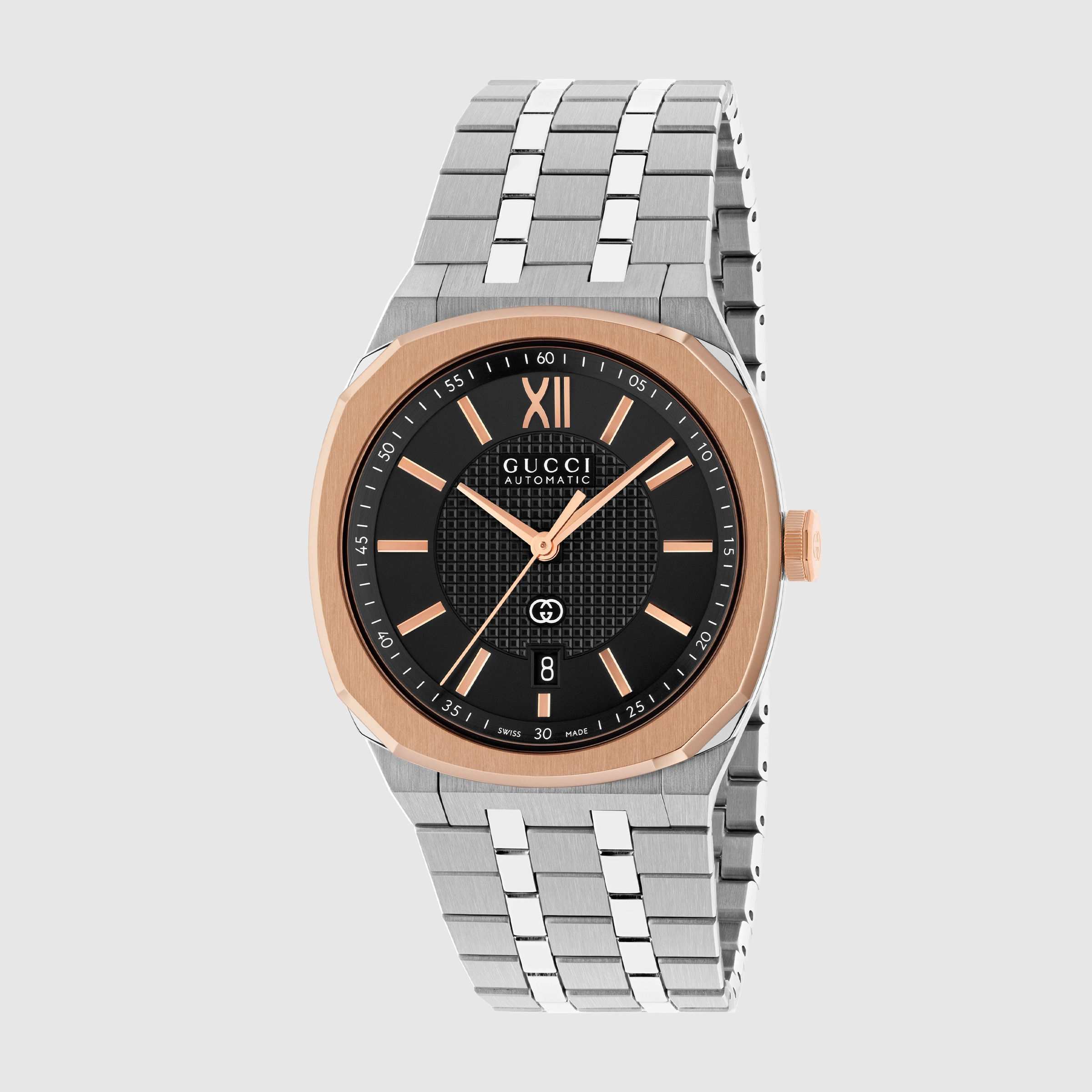 The latest GUCCI 25H collection showcases a streamlined silhouette, featuring refined elements that enhance the watch's sleek design. Powered by an automatic movement, the accessory is defined by a steel interchangeable bracelet and a stainless steel case with black dial. - 40mm stainless steel multi layered case - Pink gold-plated bezel and black dial - Sapphire glass with antireflective coating - Stainless steel interchangeable bracelet - The warranty certificates for Gucci watches purchased after March 1st 2022 are exclusively available online. - Download your certificate at - by using the serial number engraved on the back of your watch. - Automatic movement - 5 ATM (50 meters/164 feet) - Power reserve: 38 hours - YA163352 - Wrist size from 5.7" to 7.8"