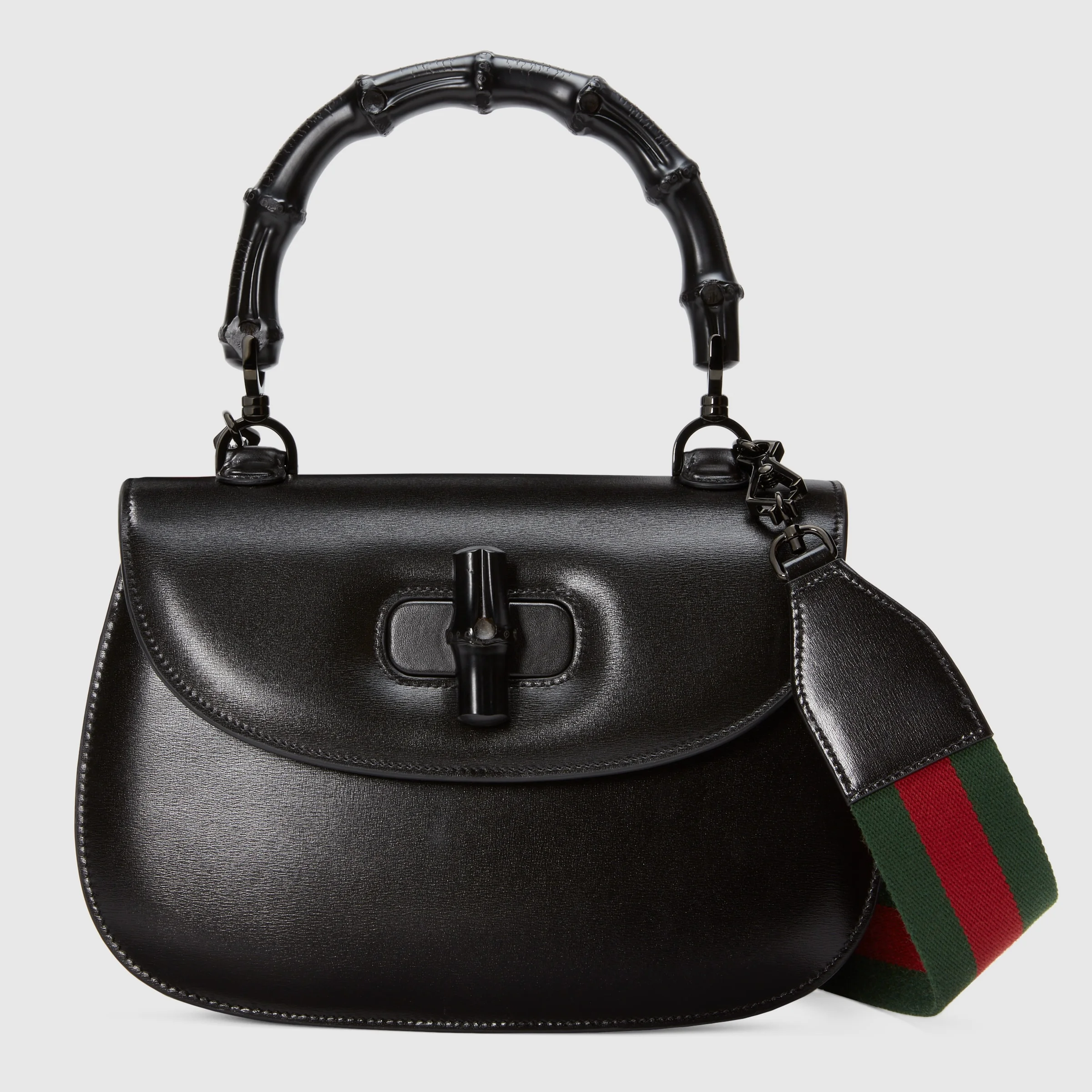 Heritage elements are reimagined with a contemporary twist throughout The Gucci Aria collection. An emblem of Gucci's origins, bamboo has appeared throughout the House's collections since the '40s. After over eight decades, the material is paired with black leather and two interchangeable shoulder straps atop this medium bag—a smooth leather version enhances the style's classic feel while the Web stripe adds logo appeal. - Black leather - Black bamboo hardware - Interchangeable black leather and green and red Web straps - Lining: leather - Inside: 1 zip pocket; 1 open pocket with mirror - Handle drop: 5.5" - Strap drop: 19.7" - Weight: 1.96kg - Medium size: 10.2"W x 6.7"H x 3.5"D - Made in Italy - The first person is 5'6" tall, the second person is 5'8" tall