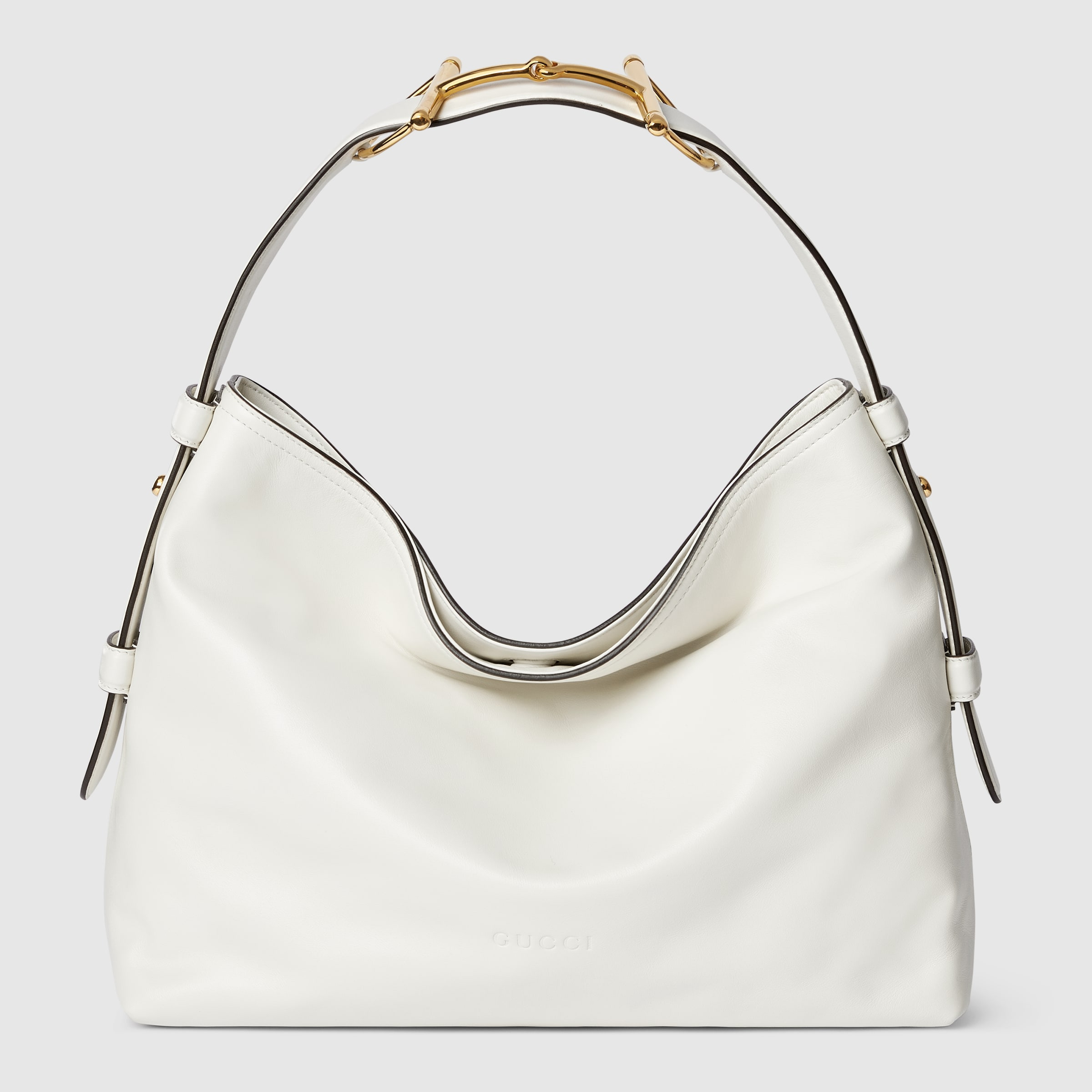 In the Fall Winter 2025 collection, the Gucci Beatrix handbag features a relaxed silhouette elevated by the signature Horsebit detail on the shoulder strap. The gold-toned hardware enhance its refined feel, while a zip pocket inside keeps essentials secure. Elegant yet functional, it's designed to carry your everyday must-haves with ease. - White soft smooth leather - Gold-toned hardware - White cotton linen lining - Horsebit detail on the shoulder strap - Inside: zip pocket - Shoulder strap: 8.3" drop; 33.5" length - W13.8" x H10.8" x D4.3" - Weight: approximately 1.54lbs - Made in Italy - Fits iPhone Pro Max/Plus, Airpods, long wallet, and lipstick