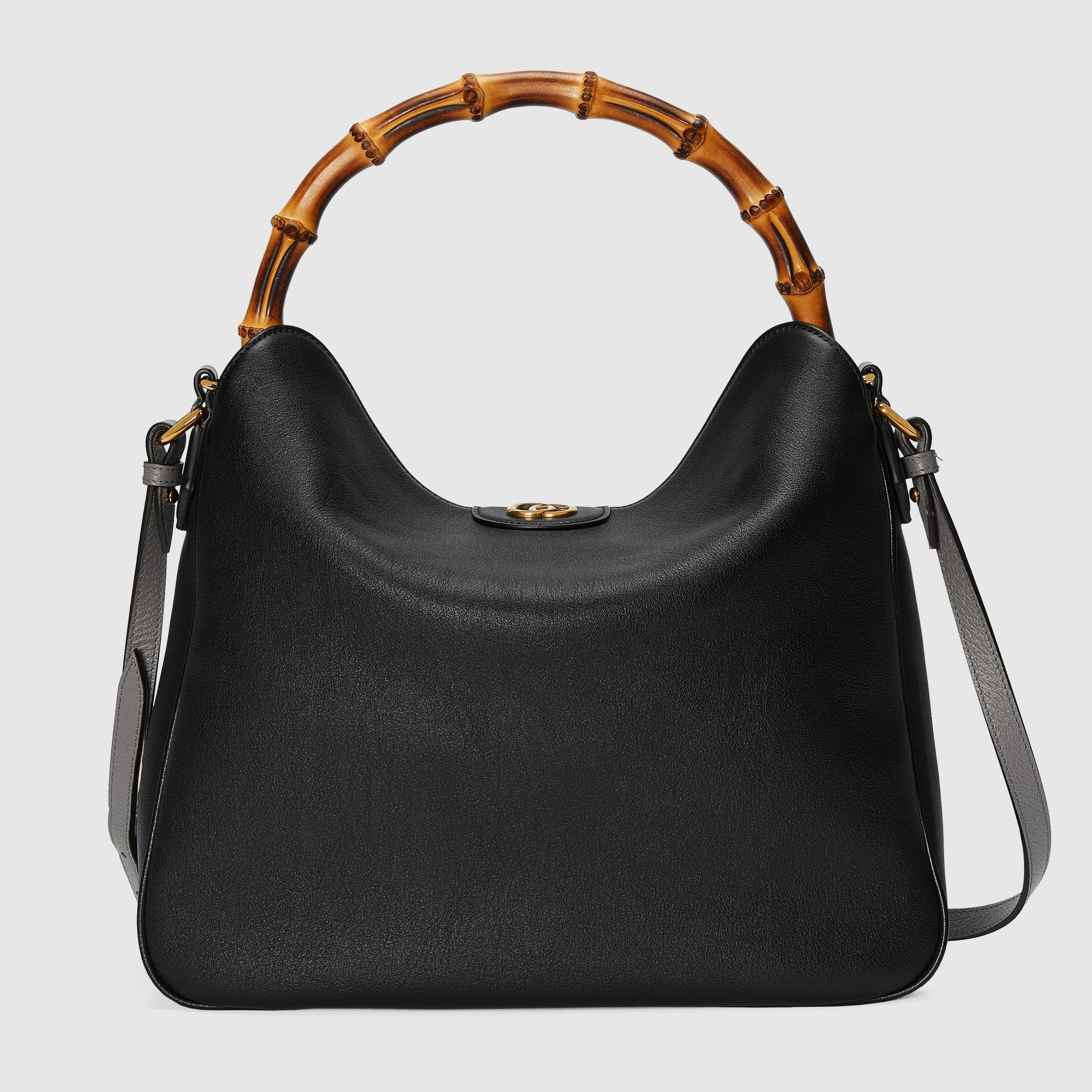 Combining recognizable elements of the House, the large-sized shoulder bag is defined by its bamboo handles and Double G hardware. Crafted from black leather, the accessory is further accentuated by a contrasting leather shoulder strap. - Black leather - Grey leather trim - Gold-toned hardware - Microfiber suede-effect lining - Double G - This item comes with an additional leather shoulder strap - Inside: 1 zip pocket - Strap length: 36.6" - 43.3" - Bamboo top handle with 9.8" drop - Adjustable and detachable leather shoulder strap drop: 20.8" - 23.6" - Magnetic closure - Large size: 13.3"W x 10.2"H x 3.5"D - Made in Italy - The model is 5'9" tall - Fits up to: iPhone Pro Max/Plus, Airpods, long wallet, and lipstick