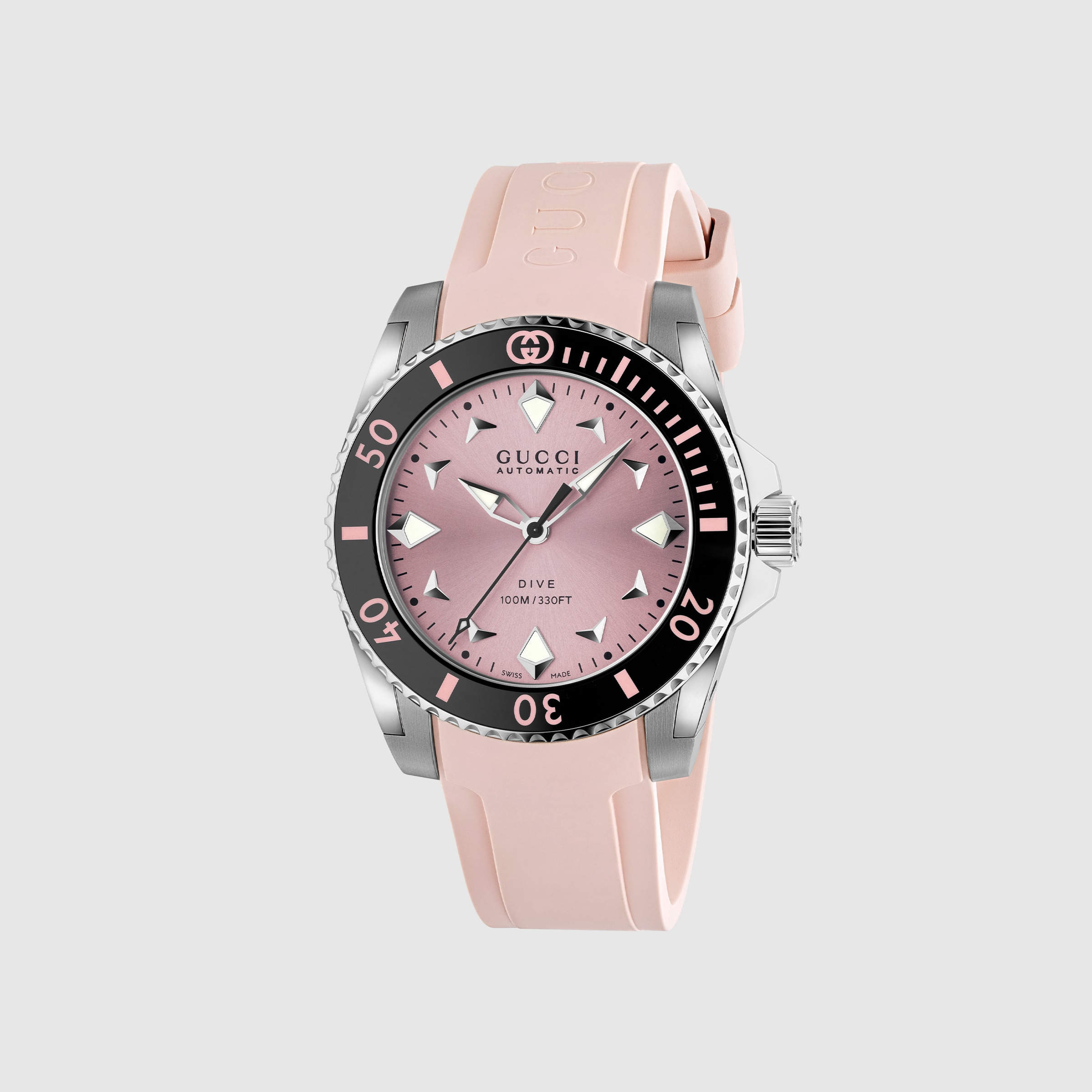 Inspired by classic diver's watch design, the Guccci Dive collection seamlessy blends timess style with high performance and a sporty elegance. Powered by an automatic movement, this watch features a pink rubber strap and a black ceramic bezel with pink dial. - 36mm stainless steel case - Black ceramic bezel, pink dial - Sapphire glass with antireflective coating - Pink rubber strap - The warranty certificates for Gucci watches purchased after March 1st 2022 are exclusively available online. - Download your certificate at - by using the serial number engraved on the back of your watch. - Automatic movement - 10 ATM (100 meters/330 feet) - Power reserve: 38 hours - YA136408 - Wrist size from 5.5" to 7.2" - Swiss Made