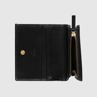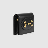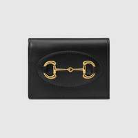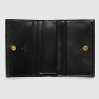 Introduced within the Gucci Horsebit 1955 accessories collection for Spring Summer 2020, the card case wallet is presented in black leather. The line is defined by the same double bar and ring design that is found within handbags—a detail that is part of Gucci's genetic code and established as one of the most distinctive elements among the House symbols borrowed from the equestrian world. - Black leather - Gold-toned hardware - Moiré lining - Horsebit detail - Five cards slots - Interior open pocket - Interior zipper pocket - Snap button closure - Open: 4.3"W x 6.9"H - Closed: 4.3"W x 3.3"H x 1.2"D - Made in Italy