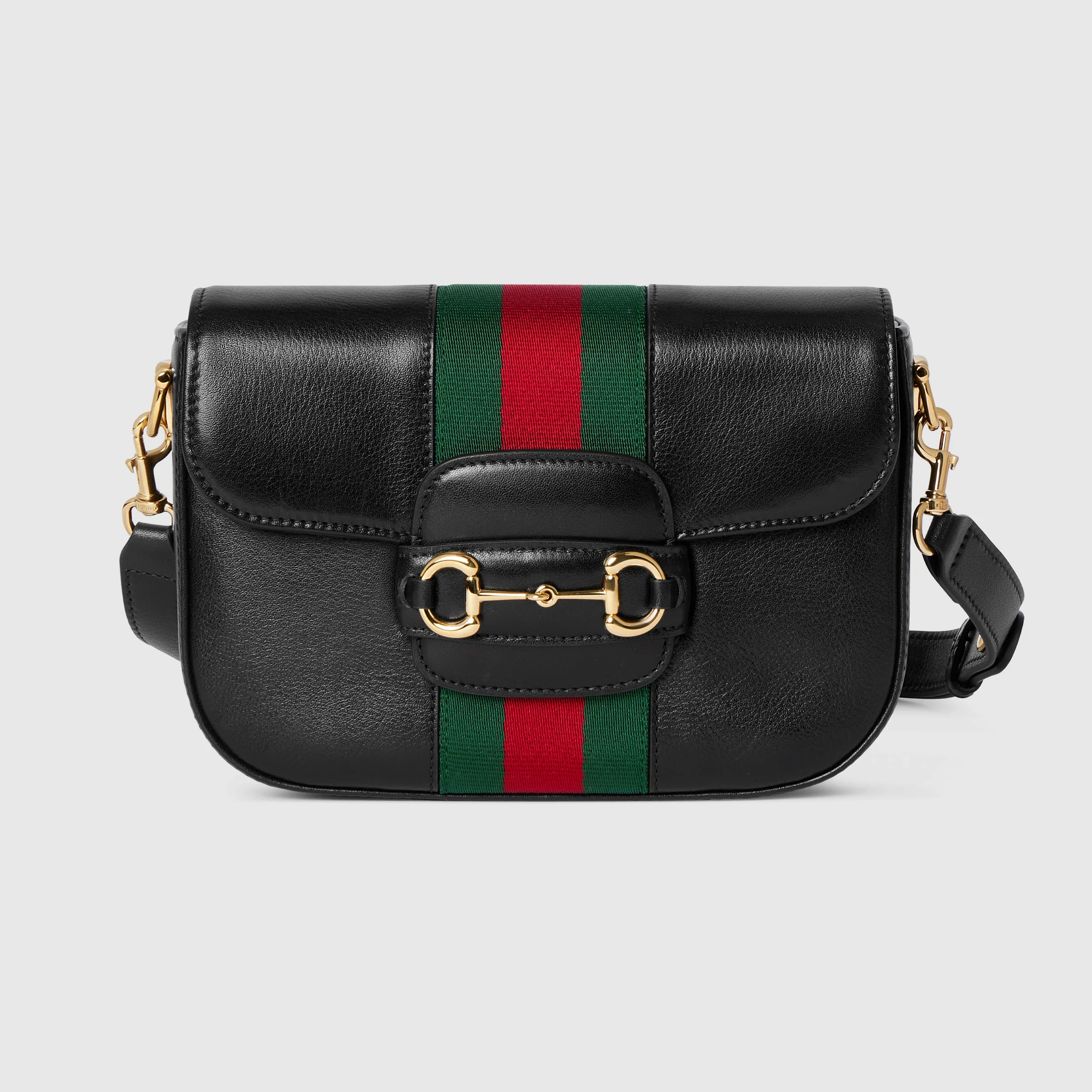 Introducing Spring Summer 2026. Gucci Horsebit 1955 proposes a supple, sophisticated shape. Crafted from soft leather, the style is complete with the Web detail and a sleek adjustable leather strap. - Black soft leather - Gold-toned hardware - Black canvas lining with Diamante motif - Horsebit and Web - Detachable and adjustable leather strap with snap buttons, drop: 11.8" - Flap closure - 8.3"W x 5.7"H x 2.2"D - Weight: 1.1lbs approximately - Made in Italy - Fits iPhone Pro Max/Plus, Airpods, small wallet, and lipstick