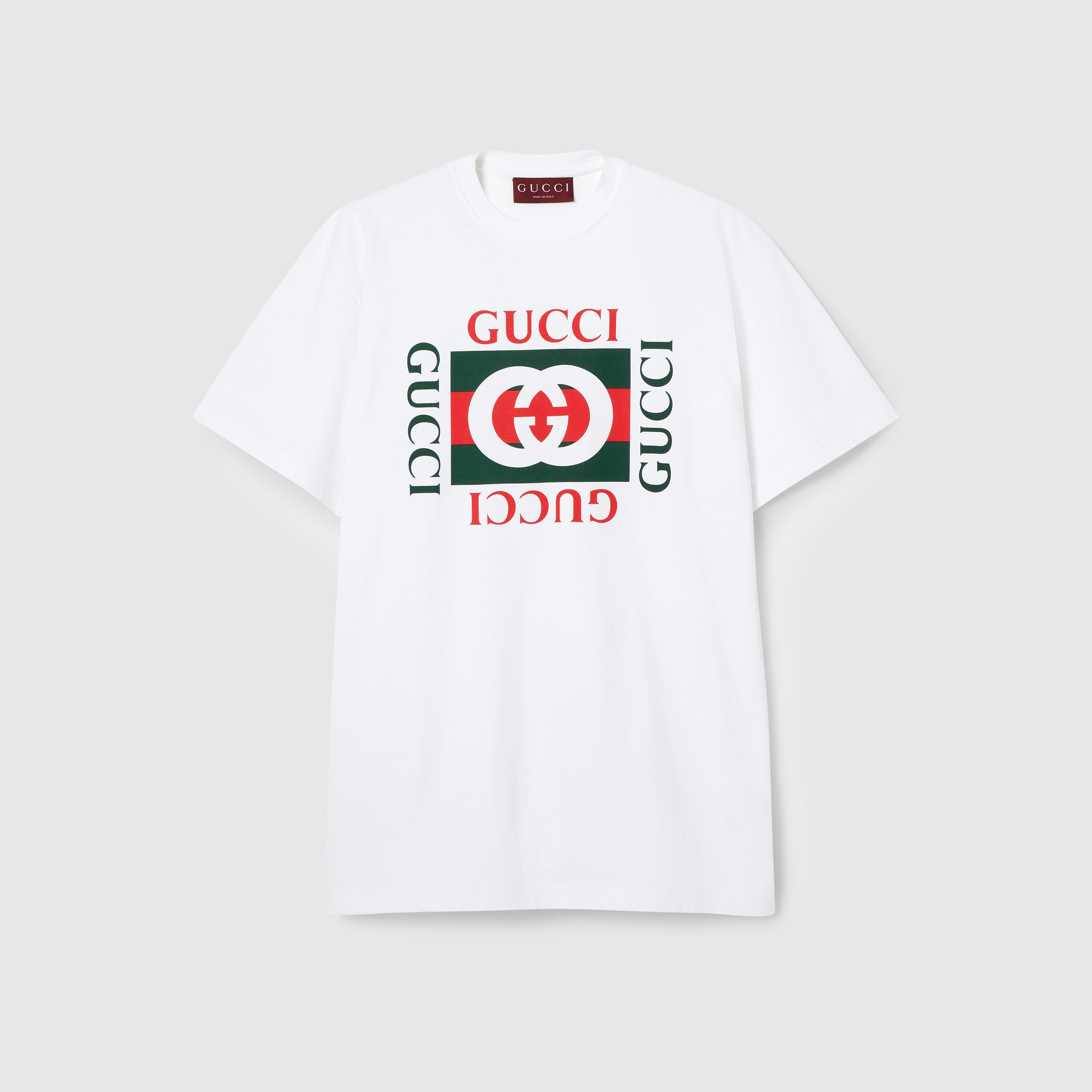 Inspired by the summer spirit and beach clubs on the Italian coast, this item is part of Gucci Lido. Emblematic codes of the House and refined patterns are reinterpreted in contemporary ways for the Pre-Fall collection. This roomy T-shirt is presented in white medium cotton jersey and defined by a Gucci Interlocking G print. - White medium cotton jersey - Gucci Interlocking G print - Crewneck - Dropped shoulder - Short sleeves - Regular fit - Length: 28.9", based on a size small - Made in Italy - The product shown in the image is a size small