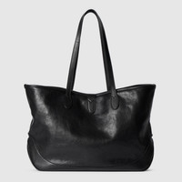 Introducing Spring Summer 2026. This new Gucci Jackie tote is crafted from soft grainy leather with natural glossy finish, and reveals a lining with the Diamante motif taken from the archive. - Black soft grainy leather with natural glossy finish - Black leather trim - Silver-toned hardware - Black canvas lining with Diamante motif - "Made in Italy by Gucci" logo under the piston closure strap - Inside: 1 zip pocket - 11" handle drop - Piston closure - 17.7"W x 11"H x 4.7"D - Weight: 1.27lbs, approximately - Made in Italy - Fits up to a 13" laptop, iPad, A4 notebook, and small items