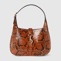 This Gucci Jackie, crafted from orange python, highlights the craftsmanship, crescent shape, and sleek silhouette of the House's signature shoulder bag. The light gold-toned hook closure and two straps give this small shoulder bag further styling options. - Orange python - Dark brown leather lining - Matching leather and Web shoulder straps with 20.4" drop - Interior: 1 zip pocket with Gucci Crest zip puller - 7" handle drop - Hook closure - Small size: 10.8"W x 7.4"H x 1.5"D - Made in Italy - Fits iPhone Pro Max/Plus, Airpods, long wallet, and lipstick
