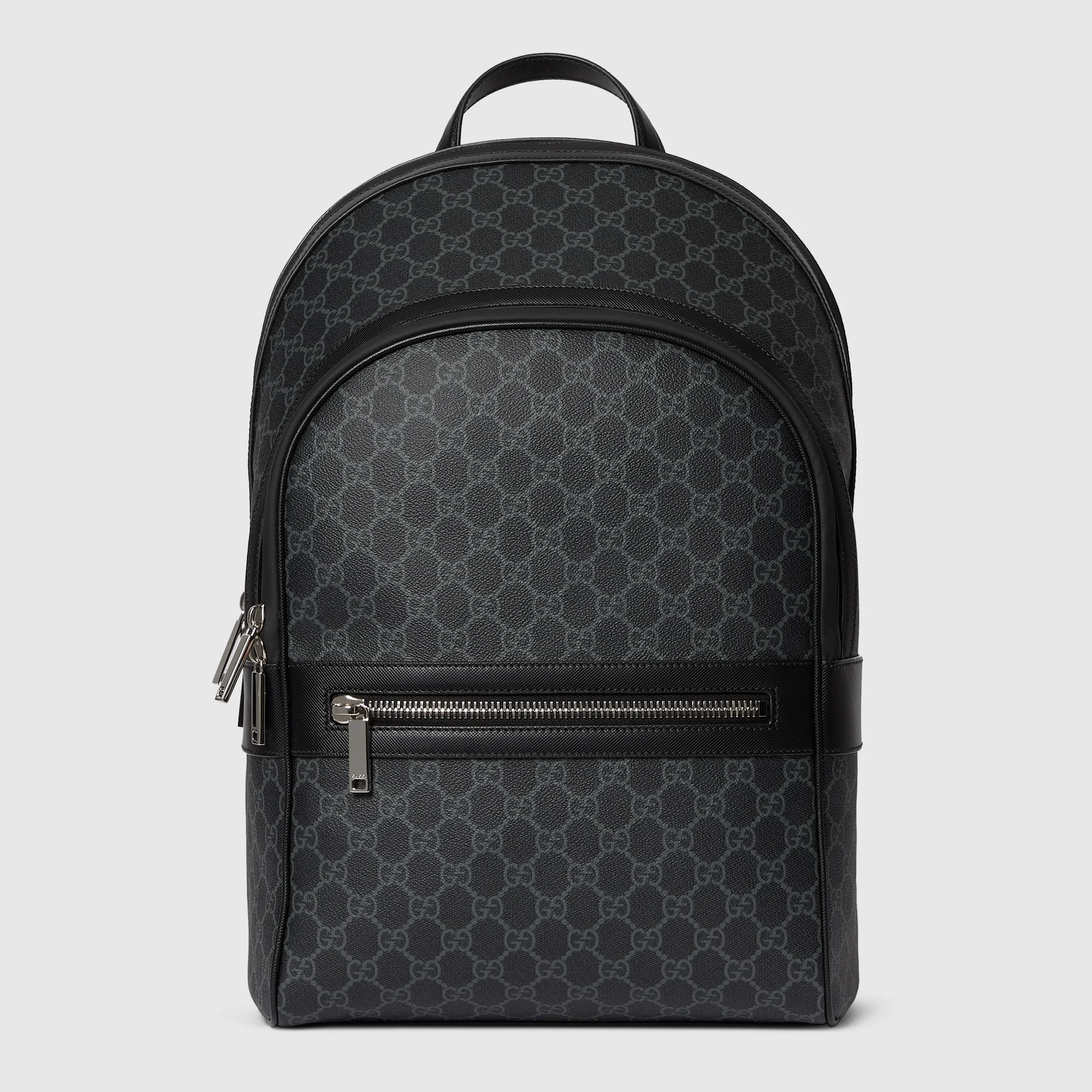 Referencing the House's beginnings in the world of luggage and Guccio Gucci’s time at the Savoy Hotel in London, travel items continue to evolve to embrace the contemporary. This medium backpack is presented in soft GG Supreme with adjustable Web shoulder straps and a padded mesh back for increased comfort. - Black soft GG Supreme - Black leather trim - Black GG nylon lining - Adjustable Web shoulder straps - Padded mesh back - Outside: 1 front zip pocket - Top handle with 2.1" drop - Zip closure - 11"W x 17.3"H x 6.1"D - Weight: 0.5lb, approximately - Made in Italy - Fits a laptop, iPad, A4 notebook, and small items