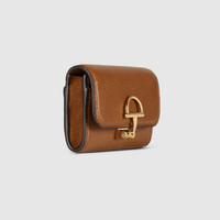Gucci continues to expand upon its heritage and bond with the equestrian world. The half-Horsebit motif defines a selection of small leather goods as part of the closure detail. Here, the emblematic symbol appears on this card case crafted from brown grainy leather. - Brown grainy leather - Gold-toned hardware - Brown taffeta lining - Half-Horsebit - Inside: 1 zip pocket, 1 flat pocket, 1 compartment - Outside: 1 open pocket - Snap closure - 4.1"W x 2.7"H x 1.2"D - Weight: 0.14lbs, approximately - Made in Italy