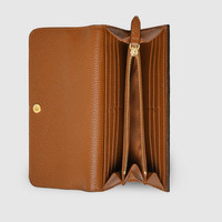 Gucci continues to expand upon its heritage and bond with the equestrian world. The half-Horsebit motif defines a selection of small leather goods as part of the closure detail. Here, the emblematic symbol appears on this continental wallet crafted from brown grainy leather. - Brown grainy leather - Gold-toned hardware - Brown taffeta lining - Half-Horsebit - Inside: 12 card slots, 2 bill compartments, 1 zip coin pocket and 2 flat pockets under the card slots - Outside: 1 flat pocket - Snap closure - Closed: 7.5"W x 3.9"H x 1.4"D; Open: 7.5"W x 7.1"H - Weight: 0.5lbs, approximately - Made in Italy