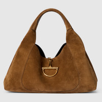 In the Fall Winter 2025 collection, the Gucci Softbit shoulder bag reimagines the House’s signature hardware as an oversized half Horsebit. It is both aesthetic and functional as the magnetic closure of the relaxed silhouette, crafted from suede with a soft leather lining. - Brown suede - Gold-toned hardware - Dark brown soft leather lining - Inside: detachable pouch - Shoulder strap drop: 7.9" - 18.1"W x 10.2"H x 6. - Weight: 3.1lbs, approximately - Made in Italy