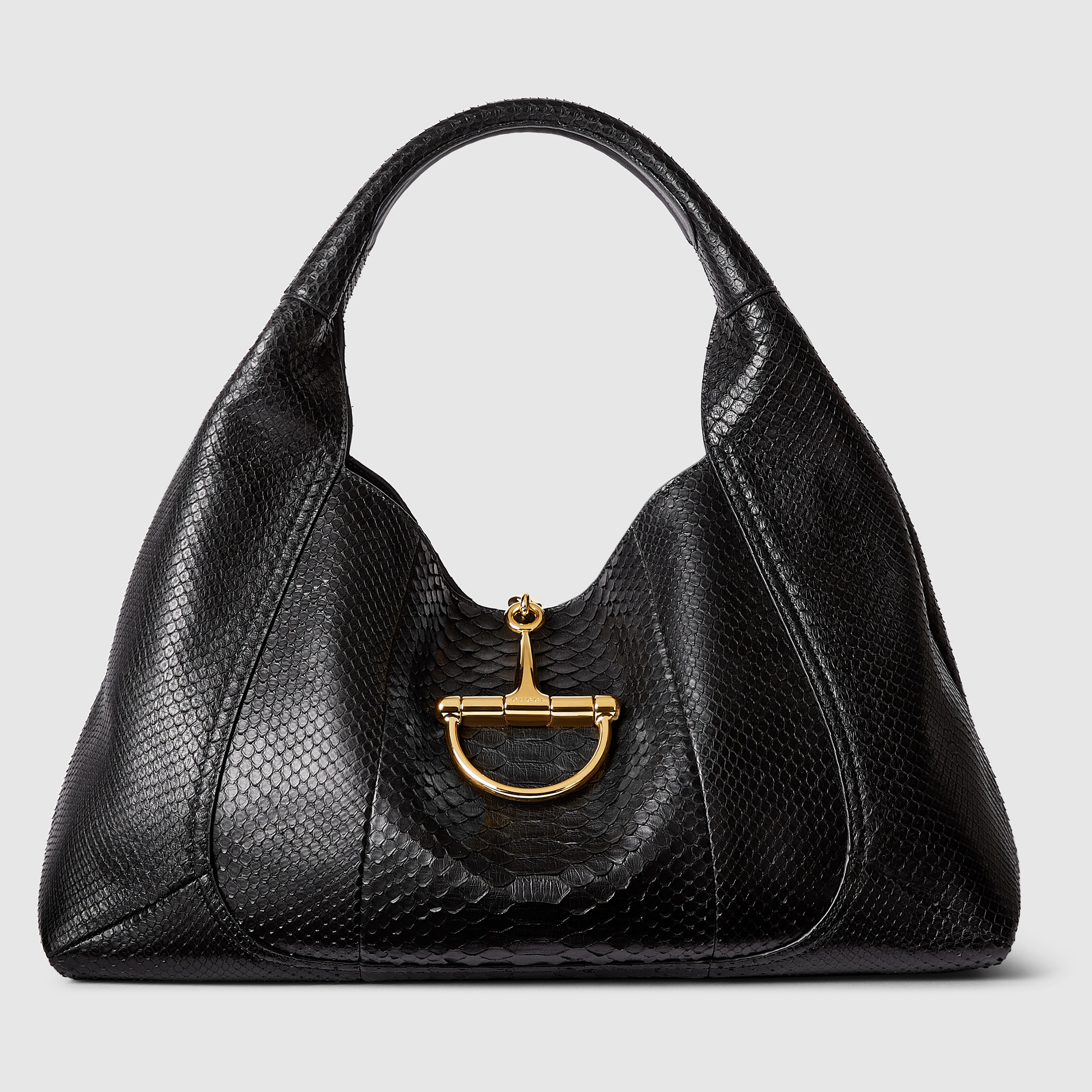 In the Fall Winter 2025 collection, the Gucci Softbit shoulder bag reimagines the House’s signature hardware as an oversized half Horsebit. It is both aesthetic and functional as the magnetic closure of the relaxed silhouette, crafted from python with leather lining. - Black python - Gold-toned hardware - Black leather lining - Inside: detachable pouch - Shoulder strap drop: 7.9" - 18.1"W x 10.2"H x 6. - Weight: 3.1lbs, approximately - Made in Italy