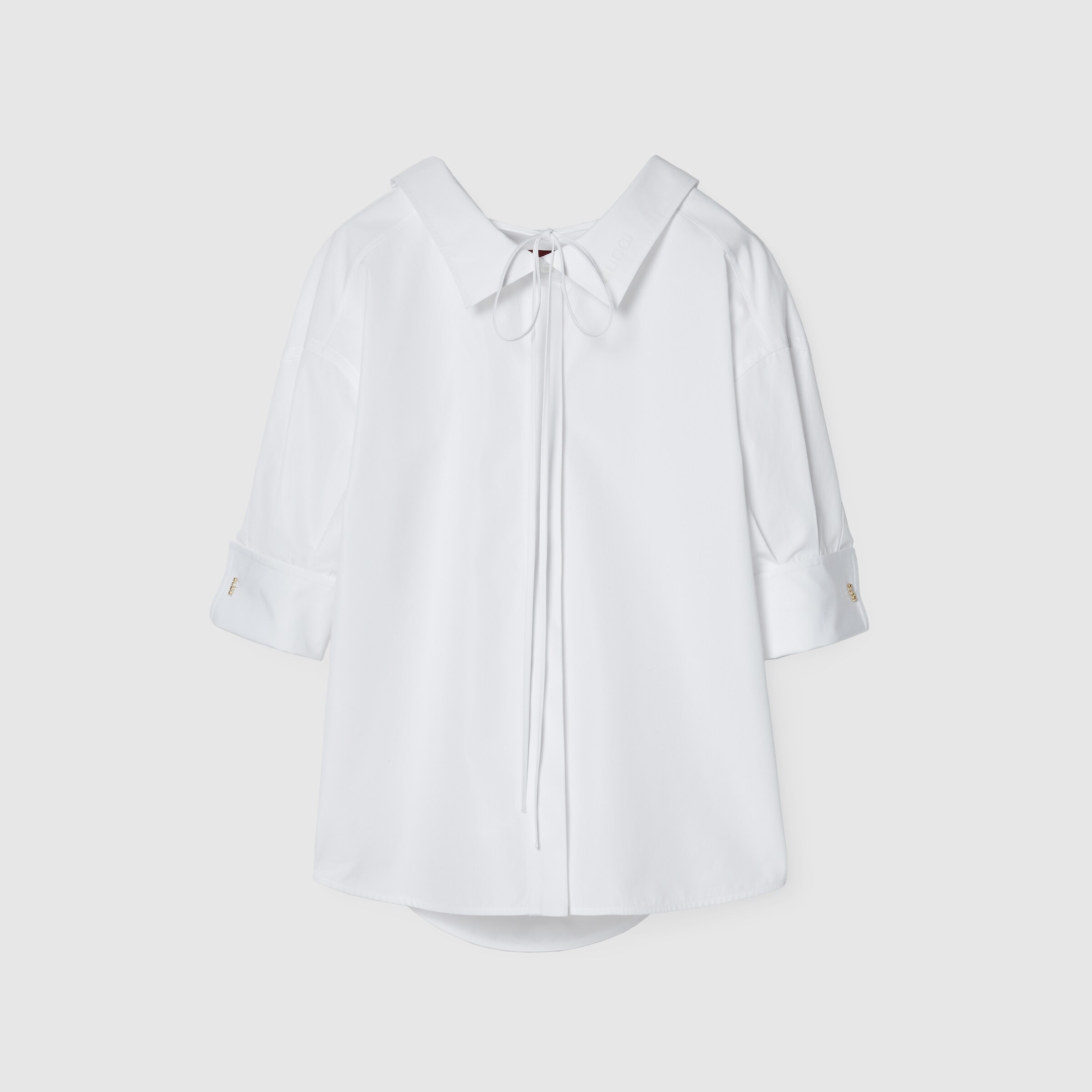 The piece is part of Sabato De Sarno's debut collection, offering a modern take on the House's well-known codes and symbols. This cotton poplin shirt provides many styling options thanks to drawstrings at the neck that allow you to wear the piece as a V-neck or a classic point-neck shirt. The relaxed fit nods to contemporary volumes and silhouettes that express femininity through an effortless look. - White heavy cotton poplin - Embossed Gucci logo at the neck - Gold-toned Gucci lettering detail at the cuffs - V-neck with self-tie - Three-quarter sleeves - Button closure - Cut for a slightly oversize fit - Length: 26.2" ; based on a size 42 (IT) - Made in Italy - The model is 5'8" and is wearing size 42 (IT)