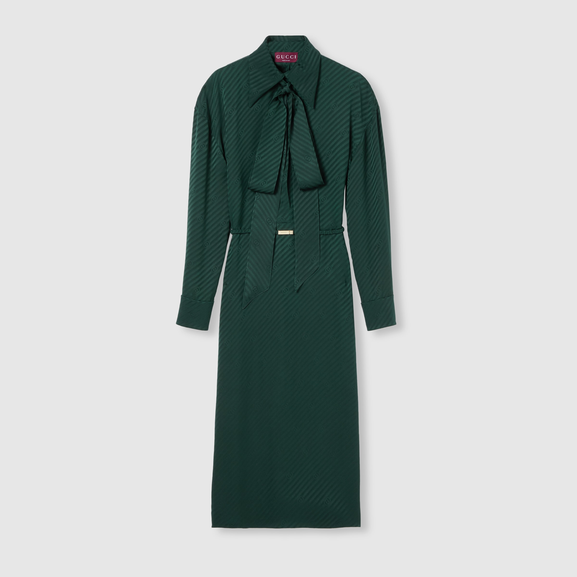 In the Fall Winter 2025 collection, fluid lines and delicate accents define an elongated silhouette. This dress features a self-tie bow at the neck. - Dark green diagonal Interlocking G silk jacquard - Unlined - Self-tie neck bow - Long point collar - Long sleeves - Covered button closure - Length: 49.2"; Sleeves: 32.7"; Shoulders: 22.8"; based on size 38 IT - Made in Italy