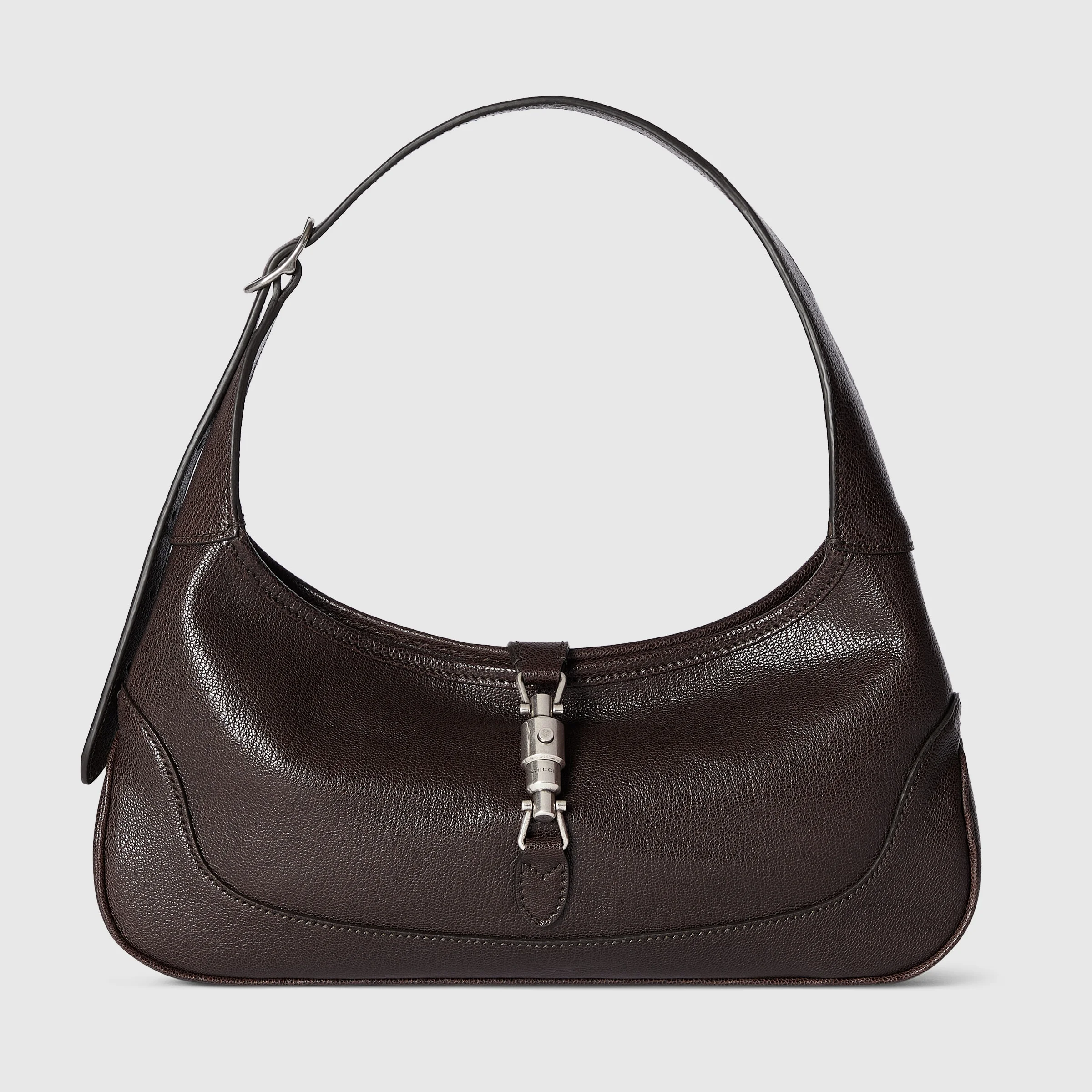 Introducing Spring Summer 2026. The new Jackie Slim presents a sleek, relaxed style crafted from soft grainy leather that has been carefully aged by hand to create a time-worn, vintage-inspired effect. It is complete with an easy-to-use piston closure, further elevating one of the House's most signature hardware details in silver-toned finish. - Dark brown soft grainy leather with natural glossy finish, aged by hand for a time-worn, vintage-inspired effect - Silver-toned hardware - Dark brown nappa leather lining - Inside: 1 zip pocket - Handle drop: 16.1" - 22.4" and adjustable length: 33.9" - 40.6" with 26.2" extender strap - Piston closure - 11"W x 6.3"H x 1.4"D - Weight: 0.6lbs approximately - Fits iPhone Pro Max/Plus, Airpods, small wallet, and lipstick