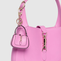 The Pre-Fall 2025 collection introduces accessories that speak to the House's signature themes. This keychain reinterprets the Gucci Jackie 1961 in a miniature motif, complete with light gold-toned hardware. - Light gold-toned hardware - Pink leather - Gucci Jackie 1961 motif - Outside: keychain hook - Hook closure and split ring - 2.7"W x 6"H x 1"D - Weight: 2.8oz approximately - Made in Italy