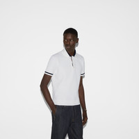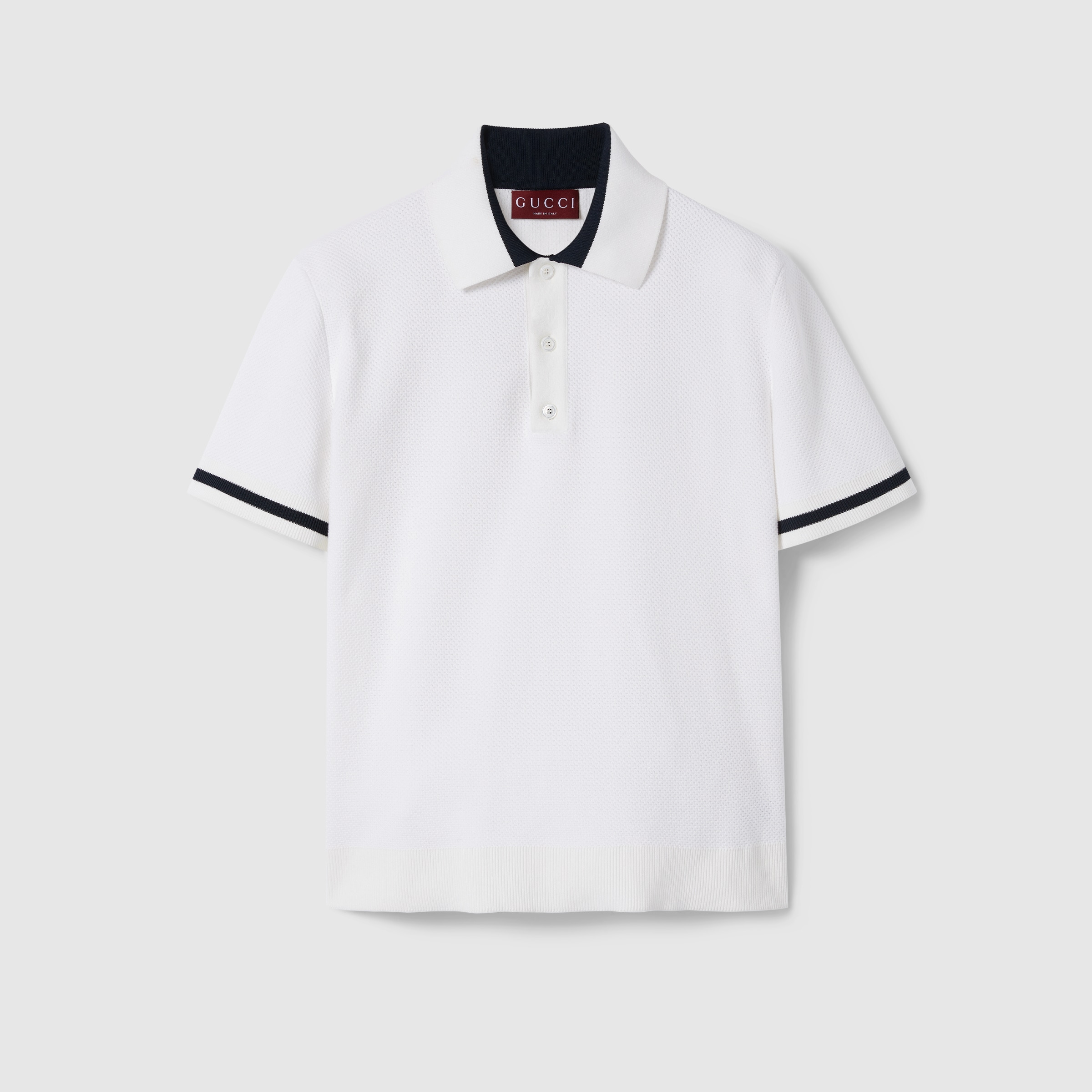 The Pre-Fall selections spotlight essential silhouettes with emblematic details from daywear to eveningwear. This straight-cut polo shirt is made from a piquet knit cotton and reveals a contrasting Gucci intarsia along the button line. - White piquet knit cotton - Black trim - Gucci intarsia - Polo collar - Short sleeves - Rib trim - Button closure - Length: 25.5", based on a size small - Made in Italy - The product shown in the image is a size small