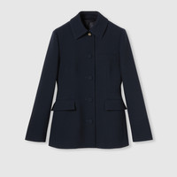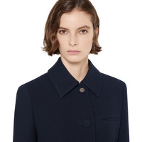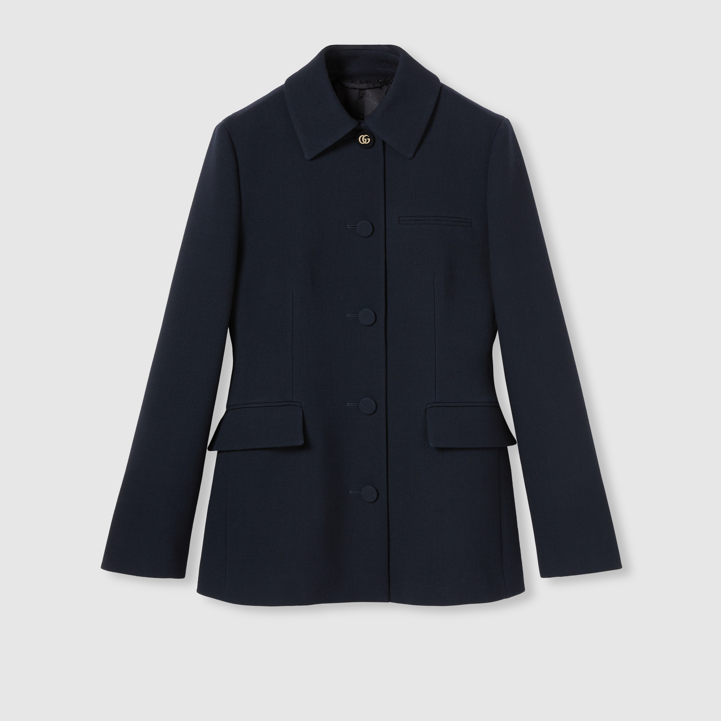 The Pre-fall 2025 collection introduces a new take on warm materials on sophisticated outerwear pieces, in traditional and contemporary silhouettes. This single-breasted jacket with a fitted waist is crafted from a refined light crepe wool and comes with Double G buttons. - Navy light crepe wool - Self-covered buttons with Double G - GG lining - Point collar - Single-breasted - Breast pocket - Two front flap pockets - Fitted waist - Button closure - Made in Italy