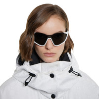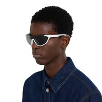 The Pre-Fall 2025 eyewear collection includes mask-shaped sunglasses with innovative shapes and striking color palettes. These mask-shaped sunglasses are presented with injection frames and a mirrored lens, enriched with a Gucci logo and metal end tips. - Matte white injection frame - Matte white injection temples with Gucci logo and metal end tips - Solid grey lens - 100% UVA/UVB protection - GG2018S - Temple length: 4.7"; Lens height: 1.8"; Nose bridge length: 0.3" - Frame height 1.9"; Frame width 5.6"; Hinge to hinge 4.7" - Made in Japan - The soft black pouch is complete with an elastic drawstring, the Gucci logo and Interlocking G details.