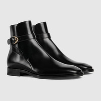 Presenting this new boot with a handcrafted leather sole, the style features an elegant buckle in light gold-toned finish. Refined details include a rounded square toe and the Interlocking G detail at the heel. - Black leather - Light gold-toned hardware - Leather lining - Interlocking G metal detail at the heel - Rounded square toe - Padded leather insole - Handcrafted leather sole with rubber insert - Adjustable leather strap with metal buckle - Flat - Height: 0.8"