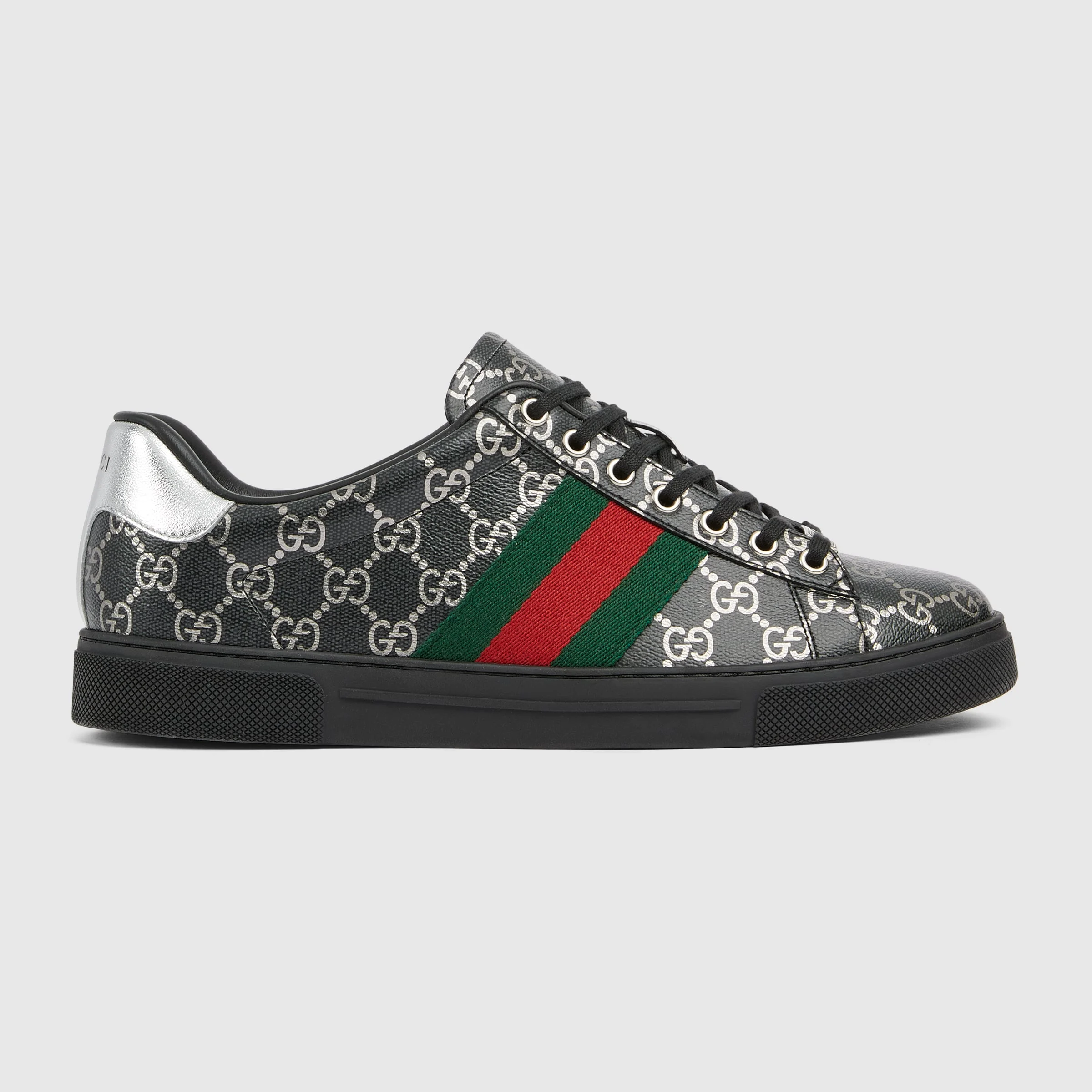 The Gucci Ace's characteristic low-top silhouette features unique details such as a silver-toned GG motif on this style. The sparkling touch is complete with a metal "ACE" tag and the House's distinctive green and red Web stripe. - Black soft GG Monogram coated fabric with sivler-toned GG motif - Leather lining - "ACE" metal tag - Web on the tongue - Logo on the back - Rubber sole - Additional pair of laces included - Flat - 0.2" height - Fits true to size