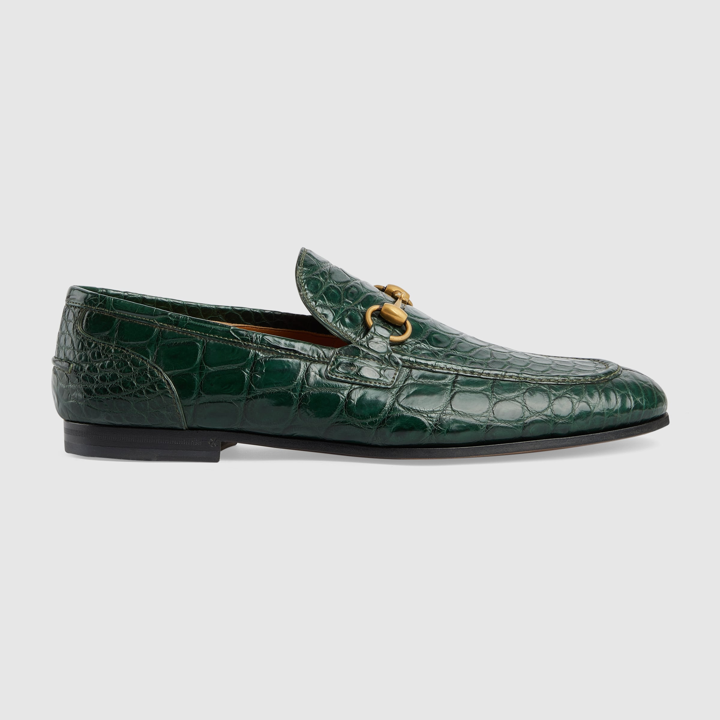 Precious materials create a new approach towards formal styles. This pair of Horsebit loafers is presented in green crocodile. The style is crafted with a Blake construction to give a comfortable, lightweight fit. - Blake construction - Green crocodile - Men's - Gold-toned hardware - Horsebit detail - Leather sole - Flat - .4" heel - Made in Italy