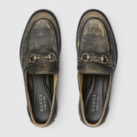 The signature loafer with Horsebit exudes classic elegance which speaks to the House's heritage. Crafted from washed-effect leather, this style is revisited with a beautifully crafted leather sole and semi-round toe. The emblematic hardware is complete with silver-toned finish. - Black washed-effect leather - Silver-toned hardware - Leather lining - Horsebit - Semi-round toe - Insole with extra cushioning - Leather sole with rubber insert - Flat - Height: 0.6"