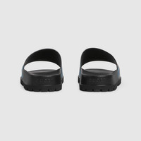Vibrant camouflage in distinctive color combinations reinterprets the emblematic GG motif. This slide is crafted with soft GG Monogram coated fabric, complete with a lug sole. - Blue and light blue camouflage soft GG Monogram coated fabric - Lug sole - Flat