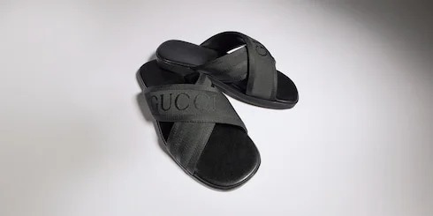 Generation Gucci delves into the brand's archival codes, and combines different generations of design into one aesthetic narrative. Tonal jacquard logo adds a refined touch on this men's slide sandal, perfect for warm weather getaways. - Black fabric - Tonal jacquard Gucci logo on crisscross straps - Rubber sole - Padded insole - Made in Italy