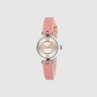 For the Cruise 2025 collection, the polished and minimalist look extends to jewelry and watches. Taking inspiration from archival codes, the Model 2000 design combines the Italian style with the Swiss craftsmanship. Presented with a pink leather strap, this watch features a silver guilloche dial, enriched with historic codes of the House. - 24mm stainless steel case - Silver guilloche dial, white resin stripes on the case side, pink gold galvanized indexes and hands - Sapphire glass with antireflective coating - Pink leather strap - The warranty certificates for Gucci watches purchased after March 1st 2022 are exclusively available online. - Download your certificate at - by using the serial number engraved on the back of your watch. - Quartz movement - 5 ATM (50 meters/164 feet) - YA167501 - Wrist size from 5.5" to 7" - Swiss Made