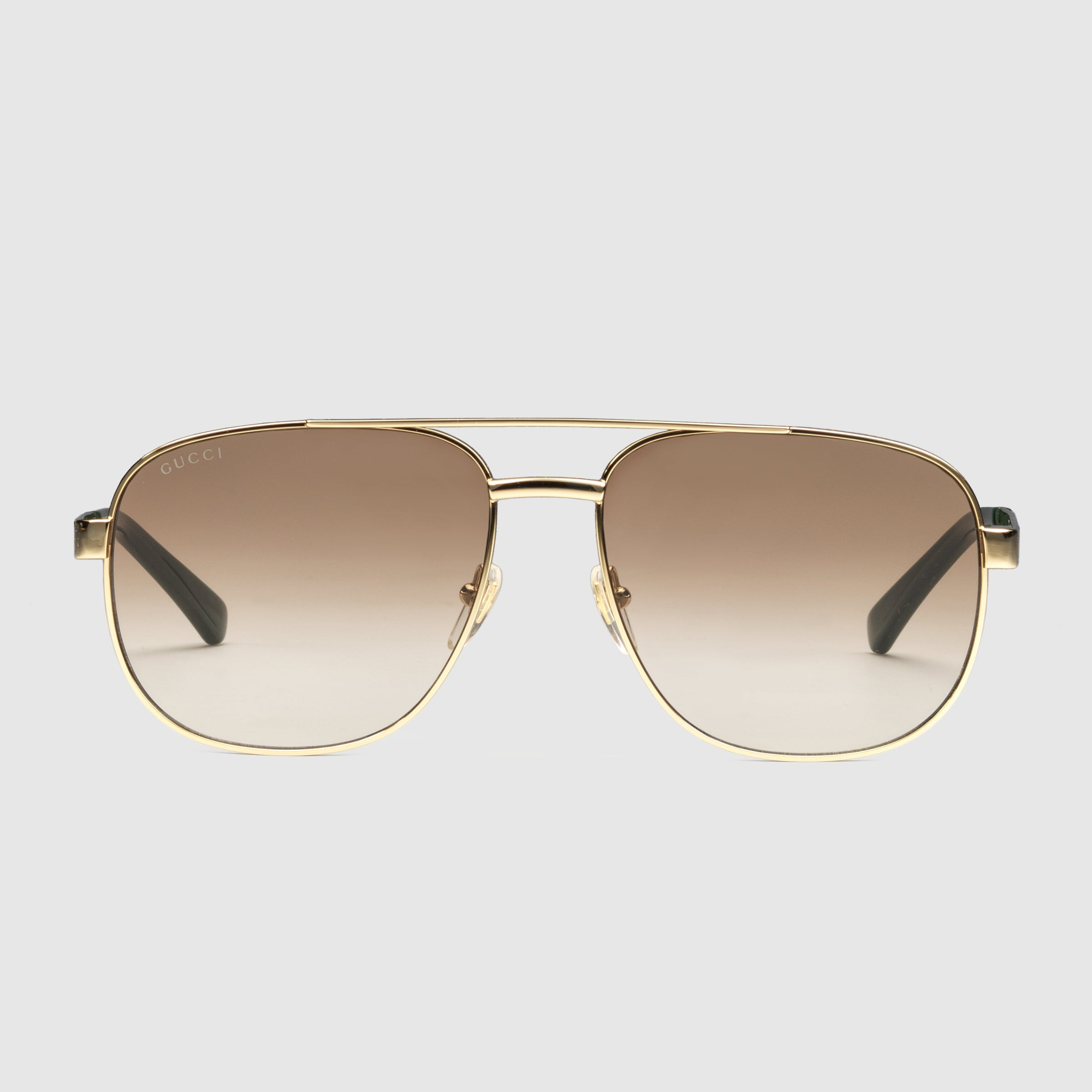 Contemporary navigator styles are redesigned through the Gucci lens. Here, tortoiseshell acetate tips complete the temples of this gold-toned metal construction. Engraved ridges enrich the silhouette for an unusual design twist. - Shiny gold-toned metal frame with top bar - Shiny gold-toned metal temples with Web enamel and tortoiseshell acetate tips - Gradient brown lens - 100% UVA/UVB protection - Frame height: 2"; Frame Width: 5.8" - GG1223S - Temple length: 5.7"; Lens height: 2", Nose bridge length: .6" - Made in Japan - The glasses will arrive in a velvet case, available in a range of six jewel-toned colors and paired with a coordinating satin lining. The case color will be individually selected for each pair of glasses and comes with a matching satin flannel pouch and ivory microfiber cloth.