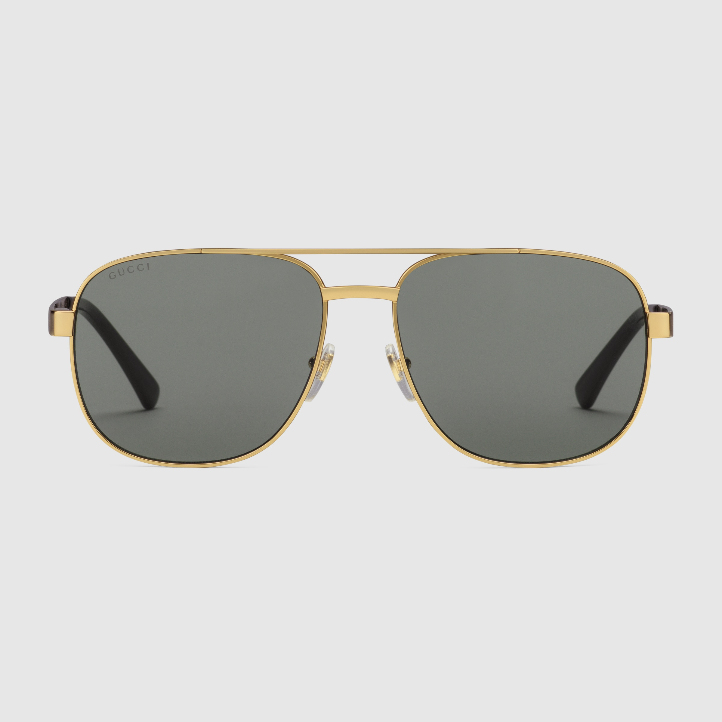 Contemporary navigator styles are redesigned through the Gucci lens. Here, acetate tips complete the temples of this gold-toned metal silhouette. An enamel Web stripe enriches the design as a subtle nod to the House's equestrian origins. - Shiny gold-toned metal frame with top bar - Shiny gold-toned metal temples with Web enamel and black acetate tips - Solid dark grey lens - 100% UVA/UVB protection - Frame height: 2"; Frame Width: 5.8" - GG1223S - Temple length: 5.7"; Lens height: 2", Nose bridge length: .6" - Made in Japan - The glasses will arrive in a velvet case, available in a range of six jewel-toned colors and paired with a coordinating satin lining. The case color will be individually selected for each pair of glasses and comes with a matching satin flannel pouch and ivory microfiber cloth.
