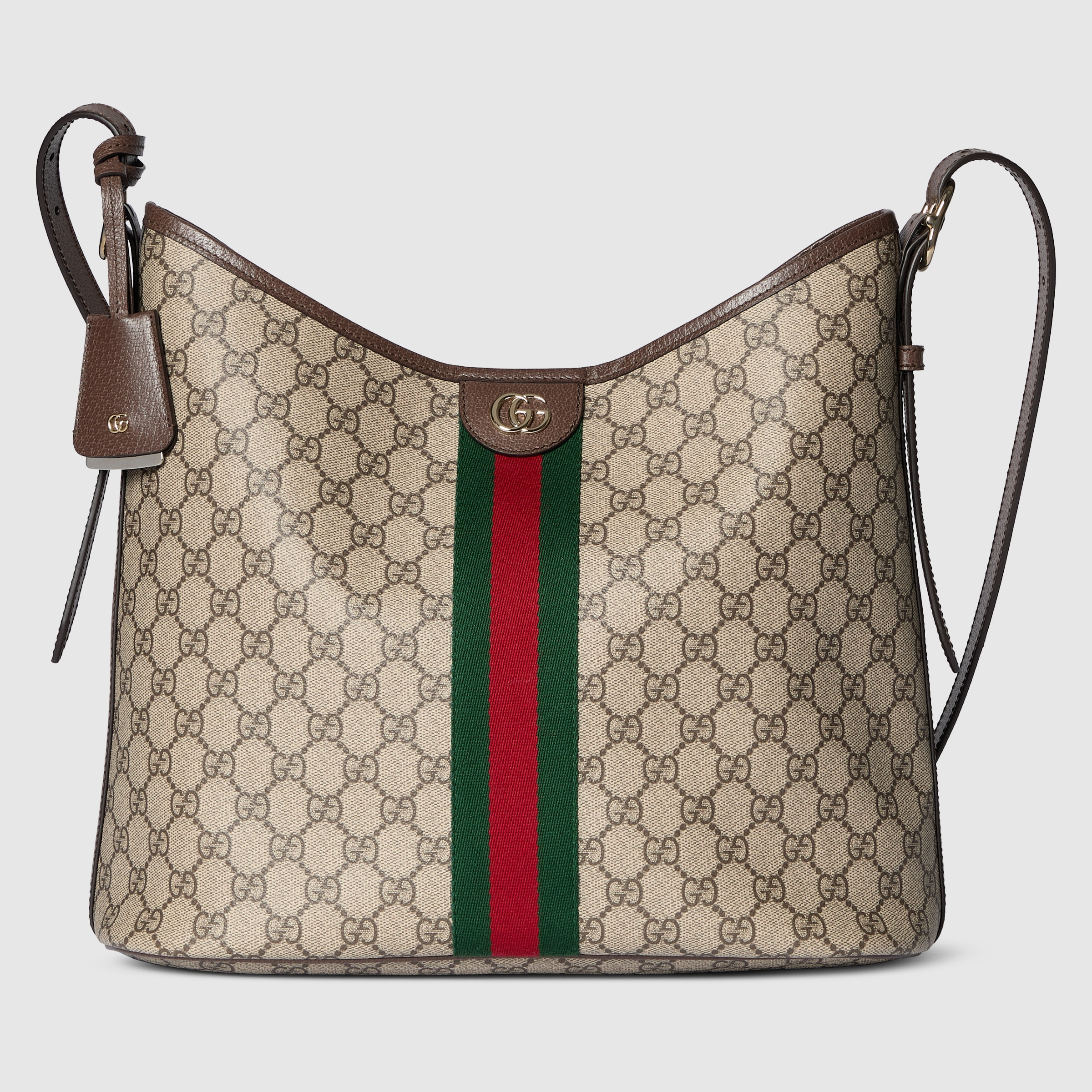 The Ophidia collection evokes the House’s heritage with the signature Web stripe and Double G emblem in light gold-toned finish. The styles are crafted from soft GG Monogram coated fabric, featuring green cotton lining inside. - Beige and dark brown GG canvas - Brown leather trim - Light gold-toned hardware - Green cotton lining - Double G - Web - Detachable pouch - Adjustable leather shoulder strap drop 15.7" - 19.7" - Hidden magnetic closure - 13.2"W x 11.8"H x 6.3"D - Weight: 1.8lbs approximately - Made in Italy - Fits iPhone Pro Max/Plus, Airpods, long wallet, and lipstick