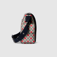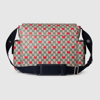 The children's Cruise 2025 collection presents a range of beloved motifs, including signature logo details. Crafted from a GG Supreme canvas, this diaper bag reveals an allover stars and hearts print and is defined by a dark blue strap. - Beige and blue GG Supreme canvas - Dark blue grosgrain trim - Allover stars and hearts print - Washable nylon lining - Inside: 3 elastic open pockets, 2 elastic bottle carriers, removable padded changing mat - Outside: 2 side pockets with magnetic closure and 1 back pocket with magnetic closure - Top handle drop: 2.4" - Strap length: 38" - 46" - Medium: 18"W x 12.6"H x 5.7"D - Weight: 4.2lbs approximately - Made in Italy