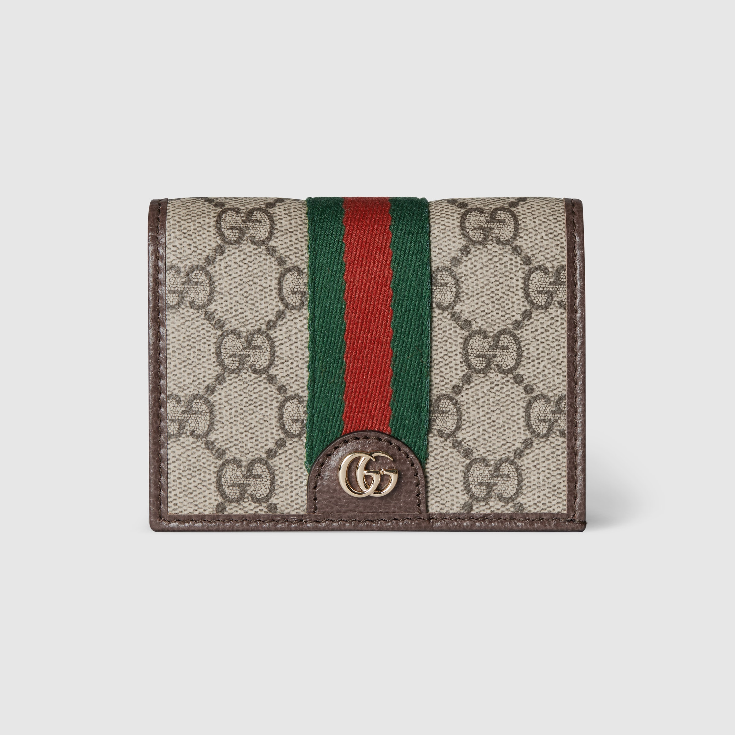 The Ophidia collection highlights reinterpreted silhouettes and functions, crafted with a soft touch in the signature beige and brown palette, such as this wallet. - Beige and dark brown soft GG Supreme - Brown leather trim - Light gold-toned hardware - Brown taffeta lining - Double G - Web - Inside: 5 card slots, 1 open pocket, 1 zip pocket, 1 bill compartment - Snap button closure - Closed: 4.3"W x 3.3"H x 1.2"D; Open: 4.3"W x 6.9"H - Weight: 4.6oz approximately - Made in Italy