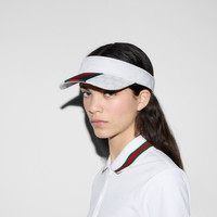 From the 1970s 'Gucci Tennis' sneaker to the present day, the House continues to express its connection to the sport with signature pieces focusing on heritage as well as innovation. This structured visor is presented in Original GG cotton canvas and enhanced with a green and red Web stripe. - White Original GG cotton canvas - Green terry cloth trim - Web stripe - Adjustable back closure - Made in Italy