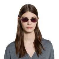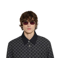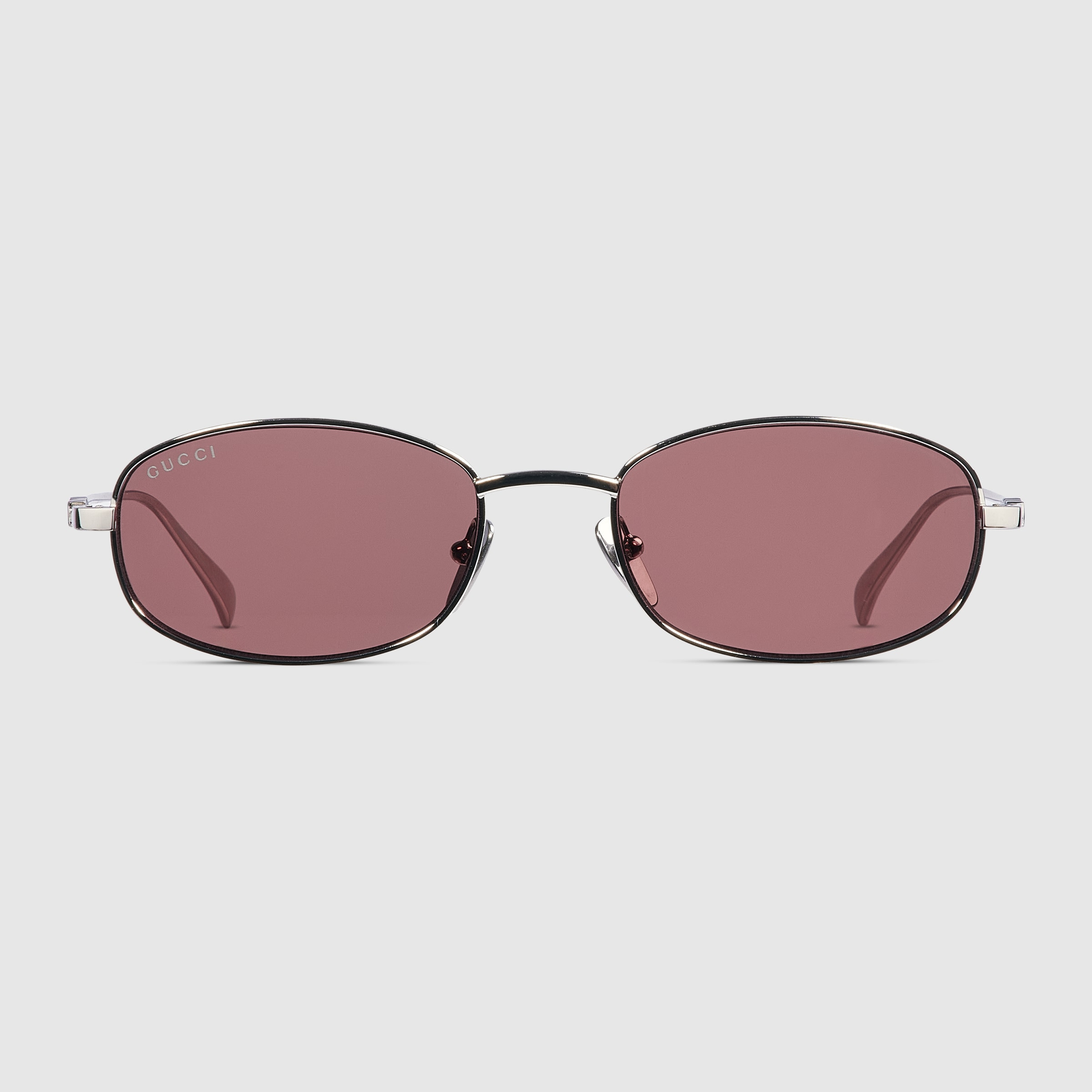 The Pre-Fall 2025 eyewear collection blends statement silhouettes from the archives with a contemporary touch. These oval frame sunglasses are stated in silver-toned metal with a cut-out Gucci logo. - Shiny silver-toned metal frames - Shiny silver-toned metal temples with cut-out Gucci logo - Solid burgundy lens - 100% UVA/UVB protection - GG1940S - Temple length: 5.5"; Lens height: 1.3", Nose bridge length: 0.7" - Frame height: 1.3"; Frame width: 5.5"; Hinge to hinge: 5.4" - The glasses will arrive in a velvet case, available in a range of six jewel-toned colors and paired with a coordinating satin lining. The case color will be individually selected for each pair of glasses and comes with a matching satin flannel pouch and ivory microfiber cloth.