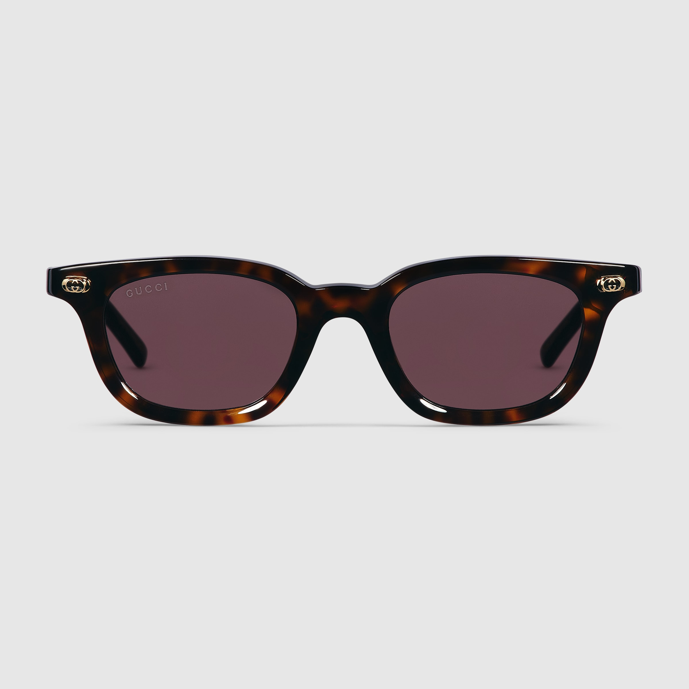 The Pre-Fall 2025 eyewear collection successfully combines the coveted silhouettes of bygone decades with a contemporary logo feel. Here, this dark tortoiseshell acetate frame pairs with an Interlocking G and engraved Gucci logo. - Shiny dark tortoiseshell acetate frames with Interlocking G - Shiny dark tortoiseshell acetate temples with engraved Gucci logo - Solid brown lens - 100% UVA/UVB protection - GG1946S - Temple length: 5.5"; Lens height: 1.3", Nose bridge length: 0.8" - Frame height: 1.6"; Frame width: 5.6"; Hinge to hinge: 5.1" - The glasses will arrive in a velvet case, available in a range of six jewel-toned colors and paired with a coordinating satin lining. The case color will be individually selected for each pair of glasses and comes with a matching satin flannel pouch and ivory microfiber cloth.