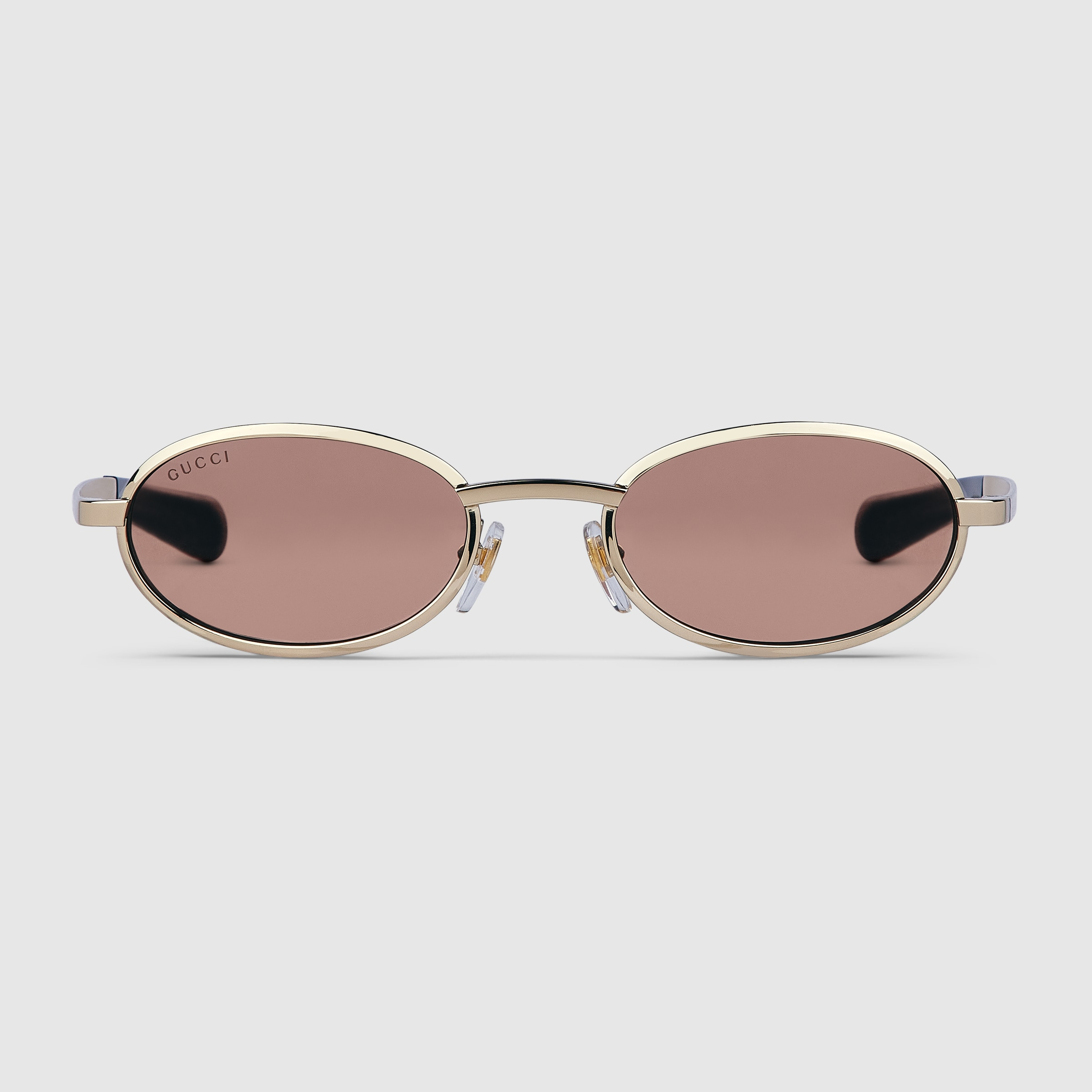 The Pre-Fall 2025 eyewear collection blends statement silhouettes from the archives with a contemporary touch. These oval frame sunglasses feature a solid brown lens and an engraved Gucci logo across the temples. - Shiny gold-toned metal frames - Shiny gold-toned metal temples with engraved Gucci logo - Solid brown lens - 100% UVA/UVB protection - GG1942S - Temple length: 5.3"; Lens height: 1.2"; Nose bridge length: 0.8" - Frame height 1.4"; Frame width 5.5"; Hinge to hinge 5.2" - Made in Italy - The eyewear case in the House’s signature Rosso Ancora red hue is complete with a magnetic closure and white interior.