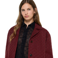 Gradient-effect crystal embroidery creates a sparkling contrast with the texture of emblematic fabrics of the House. Crafted from Gucci Rosso Ancora red GG canvas, this single-breasted jacket is enriched with gradient GG crystals. - Gucci Rosso Ancora red GG canvas - Gradient GG crystals - Quilted lining - Single-breasted - Long sleeves - Flap pockets - Front button closure - Length: 29.5"