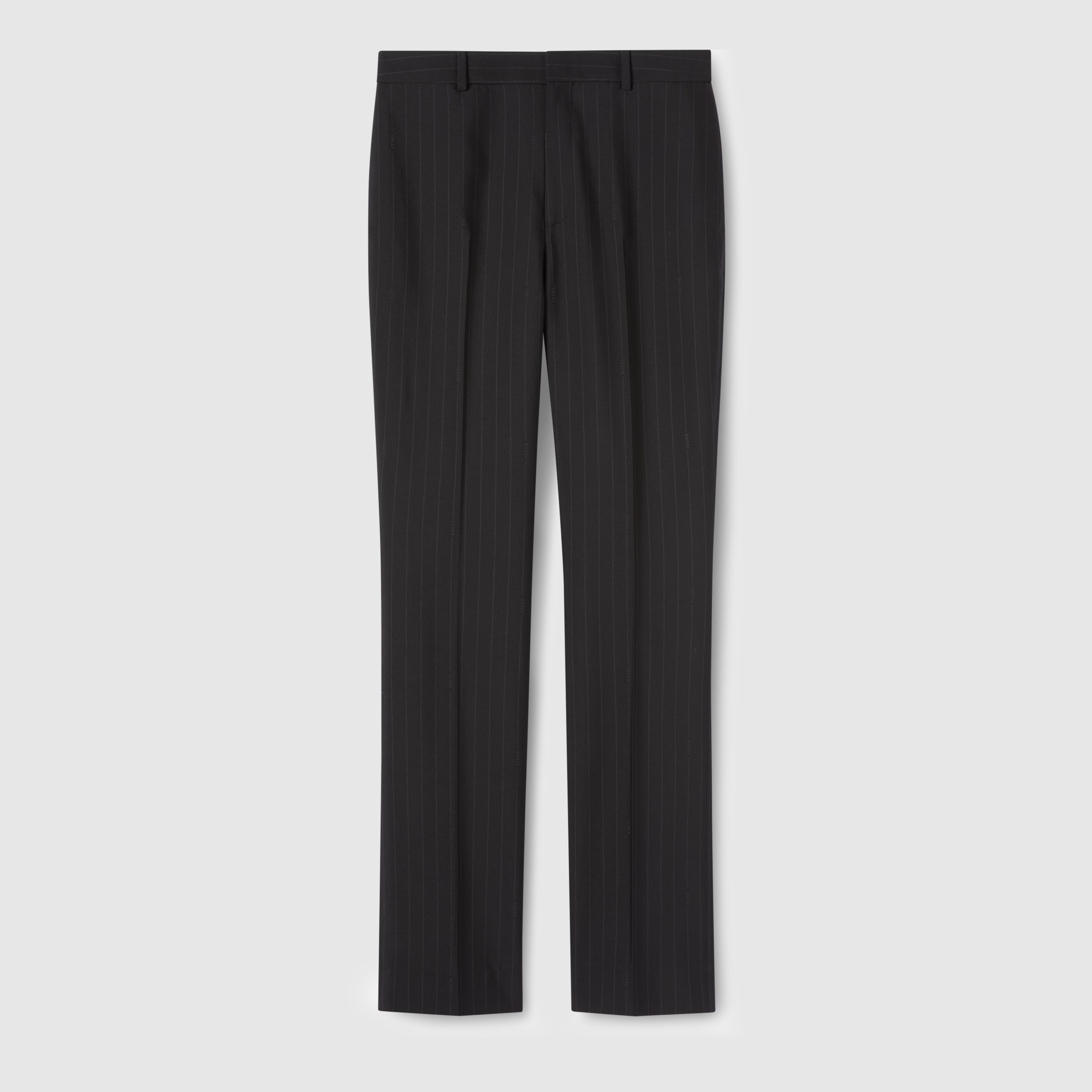 Sartorial silhouettes speak to the fine craftsmanship and sophisticated materials that have come to define Gucci's latest ready-to-wear. For Pre-Fall 2025 this classic pair of pants is crafted from a unique pinstripe Gucci wool jacquard. - Black pinstripe Gucci wool jacquard - Unlined - Belt loops - Two side pockets - Two back pockets - Hook tab and zip closure - Made in Italy