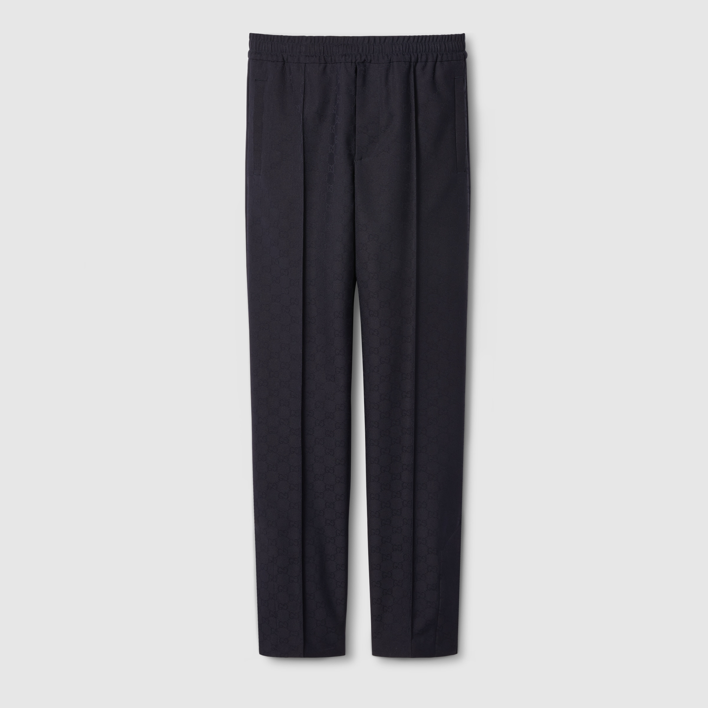 The Web is being re-envisioned as patterns and unique details through complex constructions and stitching techniques that elevate knitwear and more pieces from mere sportswear to iconic masterpieces. This pair of pants is presented in a polyester GG jacquard and enriched with a Gucci embroidery along the leg split as well as a blue and red Web detail. - Blue polyester GG jacquard - Blue and red Web - Elastic waist with drawstring closure - Two side pockets - Two back pockets - Leg split with button closure - Gucci embroidery along leg split - Waist: 16.5"; based on size 48 (IT) - Hips: 21.4"; based on size 48 (IT) - Regular fit - Length: 44.6"; based on size 48 (IT) - Leg opening: 9.05"; based on size 48 (IT) - Made in Italy - The product shown in this image is a size 48 (IT)