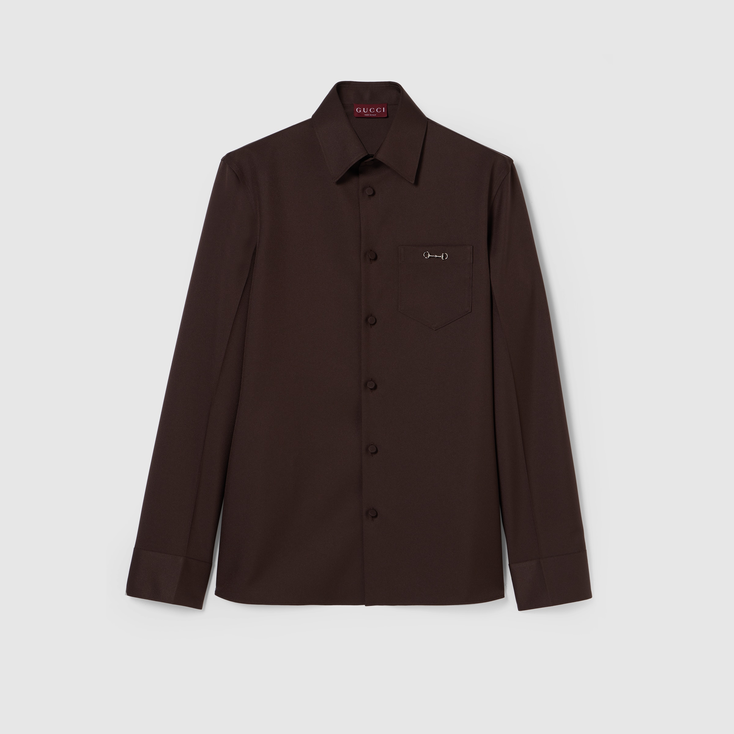 In the Fall Winter 2025 collection, Gucci's classic codes meet a streamlined silhouette. This slim fit shirt is enriched by a metal Horsebit detail on the chest pocket. The style is completed by a concealed button closure, point collar and long sleeves. - Dark brown polyester twill - Point collar - Long sleeves - Chest pocket with Horsebit - Regular fit - Total length: 28.3"; Shoulder: 17.9"; Chest: 20"; Sleeve length: 25.9"; Neck width: 15.9" (size 46 IT)