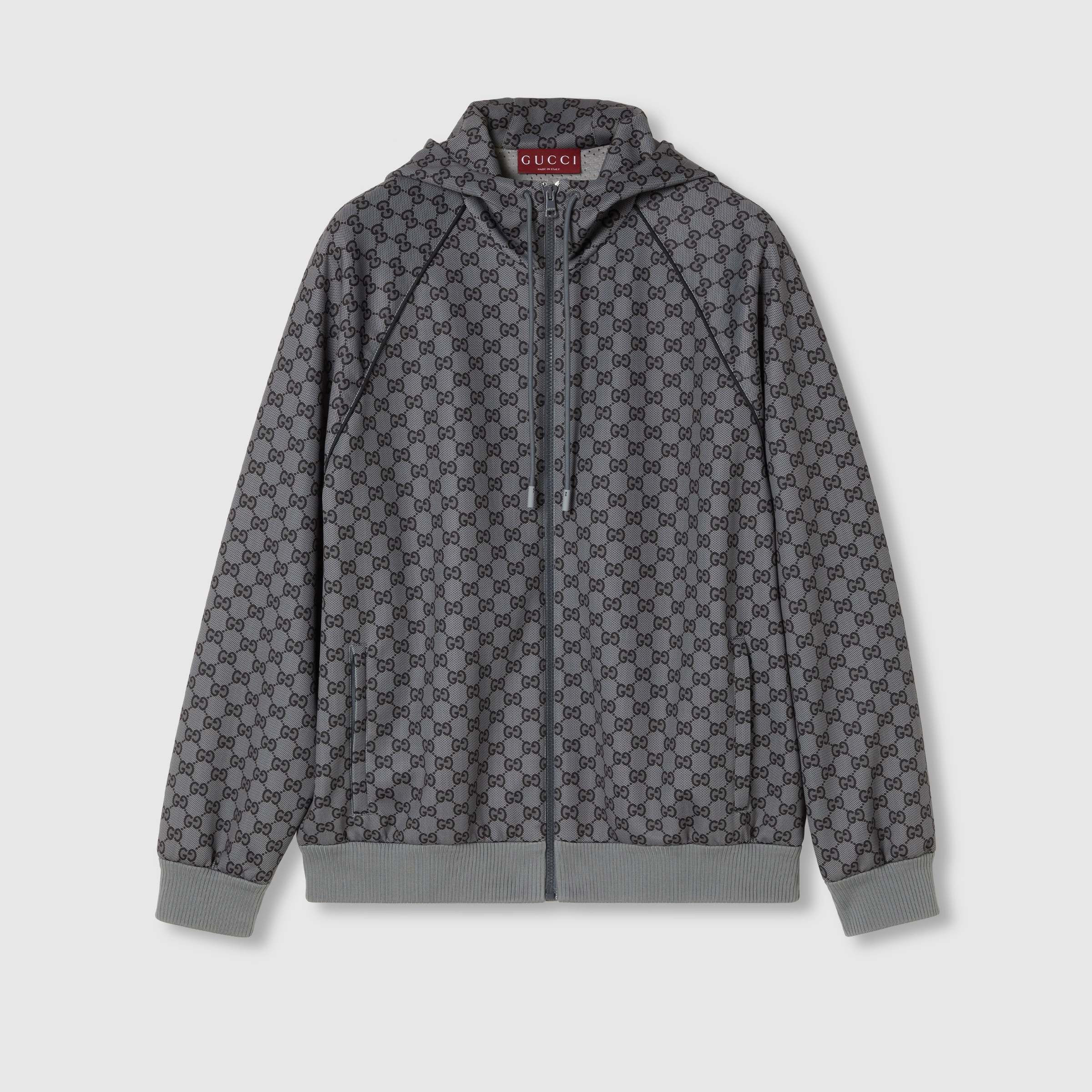 Taking inspiration from founder Guccio Gucci's monogram, the GG motif continues to be a firm favorite of the House. This zip jacket is stated in a light neoprene fabric and enriched with a black piping trim. - Grey and black light neoprene - Black piping trim - Allover GG print - Fixed hood - Long raglan sleeves - Two side pockets - Rib trim - Zip closure - Made in Italy - The model is 6'1" and is wearing size small