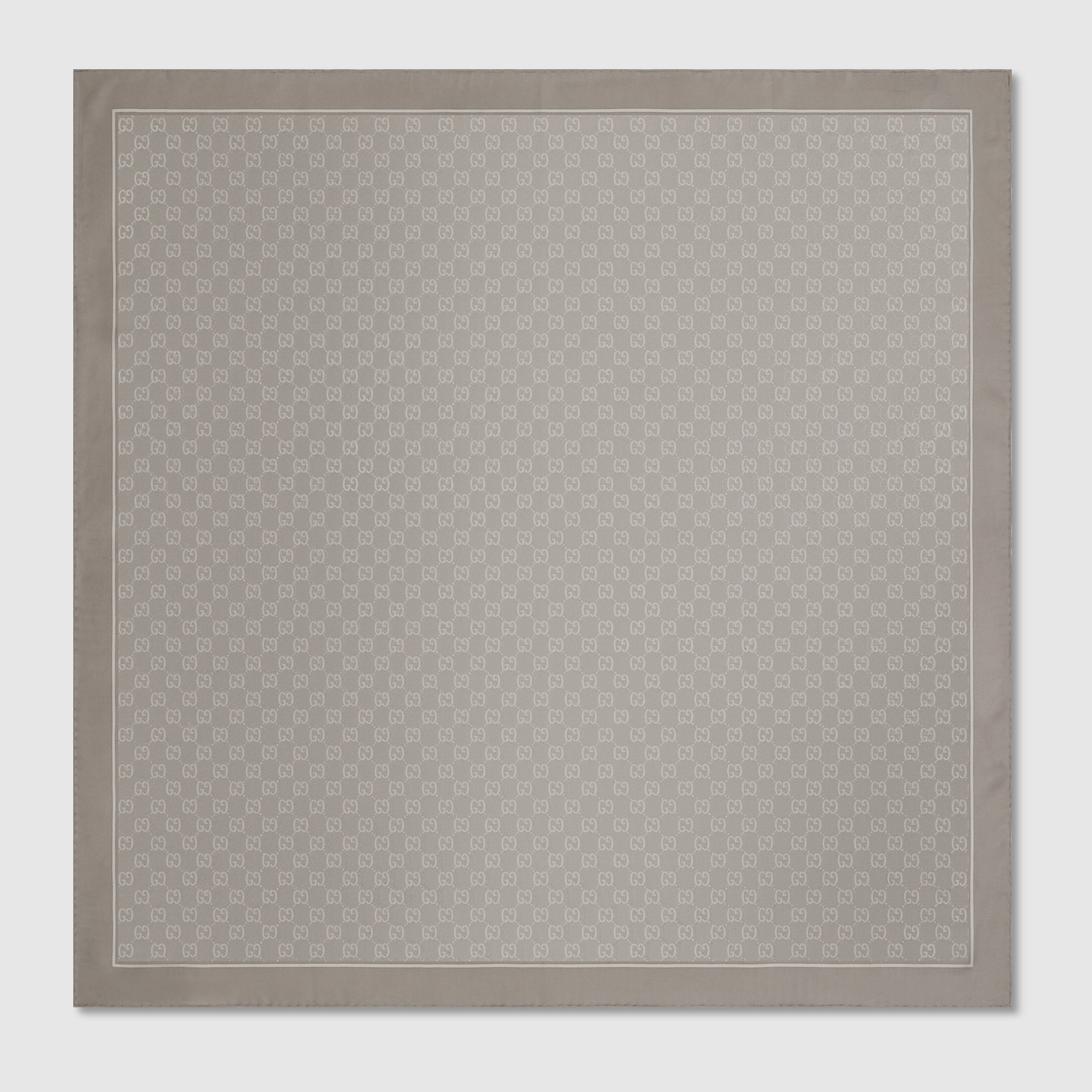 The Pre-Fall 2025 silk accessories collection animate House codes through sophisticated trimmings, logo patches and subtle embroideries. Crafted from a silk twill, this carre is defined by an allover GG print. - Light grey silk twill - Allover GG print - 35.4"W x 35.4"L - Made in Italy - The dimensions of this item may vary slightly as the hem is hand-sewn