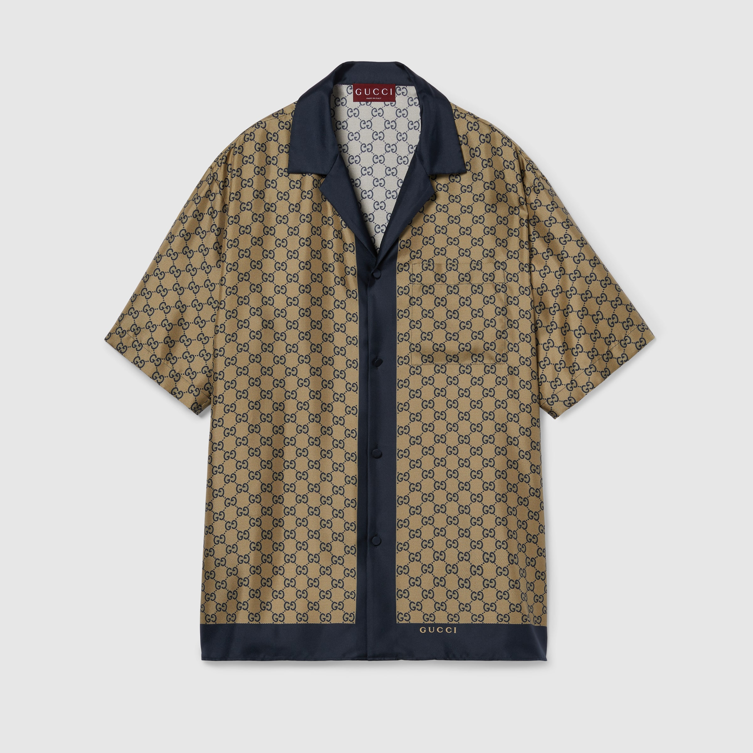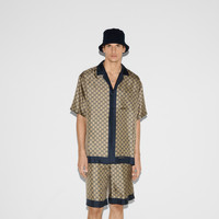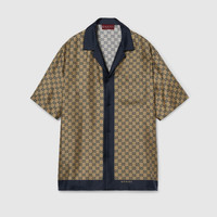 Taking inspiration from founder Guccio Gucci's monogram, the GG motif continues to be a firm favorite of the House. This relaxed shirt has been made from a silk twill with an allover GG print. - Beige and blue silk twill - Allover GG print - Open collar - Dropped shoulder - Short sleeves - Chest pocket - Side slits - Shoulder drop: 20"; based on a size 48 (IT) - Chest: 46.8"; based on a size 48 (IT) - Sleeves length: 20.8"; based on a size 48 (IT) - Button closure - Regular fit - Length: 29.5"; based on a size 48 (IT) - Made in Italy - The product shown in this image is a size 52 (IT)