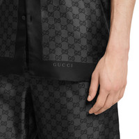 The Pre-Fall 2025 collection elevates the everyday wardrobe with a mix of textures, motifs and colors. Crafted from grey and black silk twill, this regular fit shirt features an allover GG print. - Grey and black silk twill - Allover GG print - Notch collar - Dropped shoulder - Short sleeves - Chest pocket - Side slits - Button closure - Regular fit - Length: 29.5"; Shoulder: 20.1"; Chest: 46.9"; Sleeves length: 20.9"; based on a size 48 IT - Made in Italy