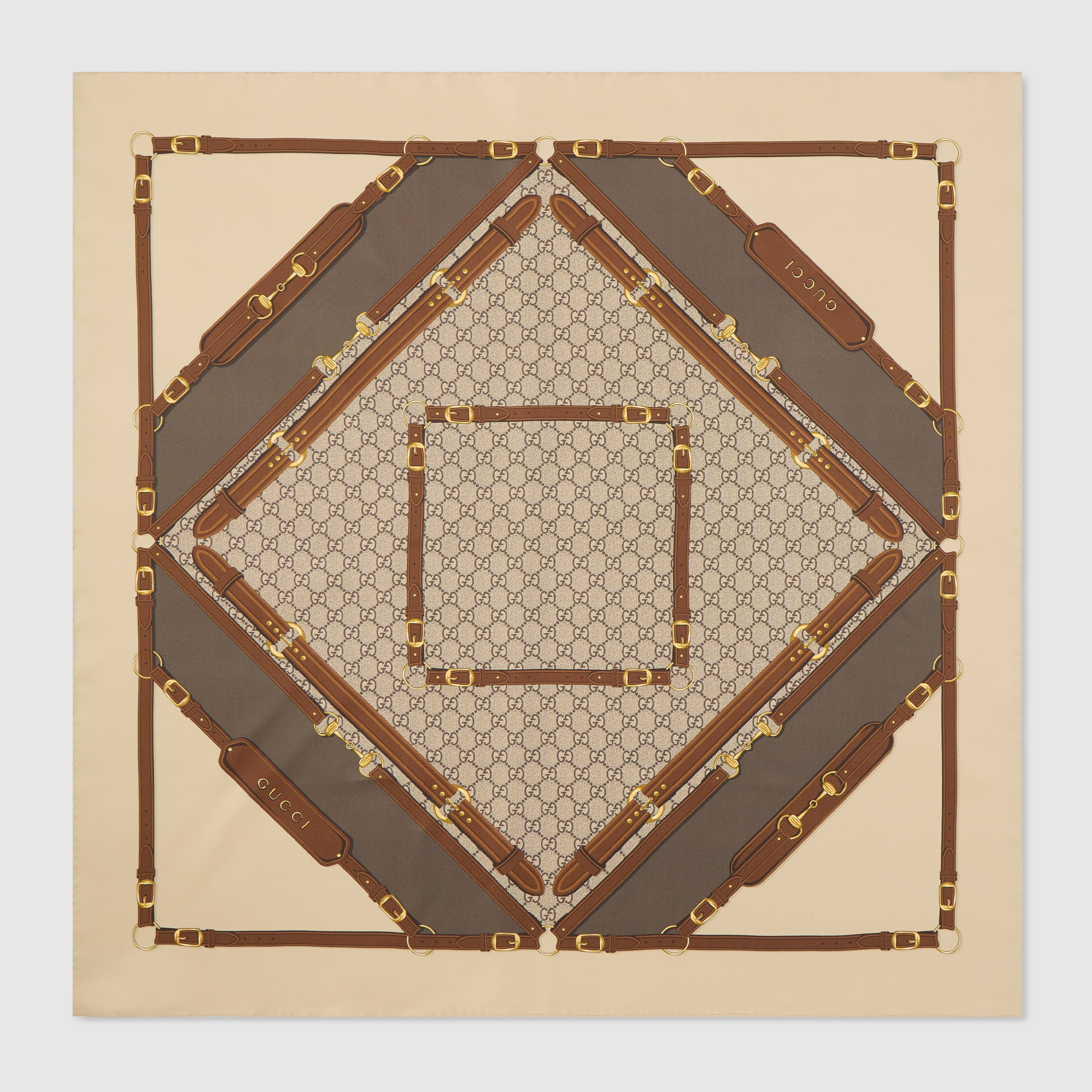 In the Fall Winter 2025 collection, the House celebrates its roots, including this silk carre with an allover Gucci belts and Horsebit print. - Beige and multicolor silk twill - Allover Gucci belts and Horsebit print - 35.4"W x 35.4"L - The dimensions of this item may vary slightly as the hem is hand-sewn