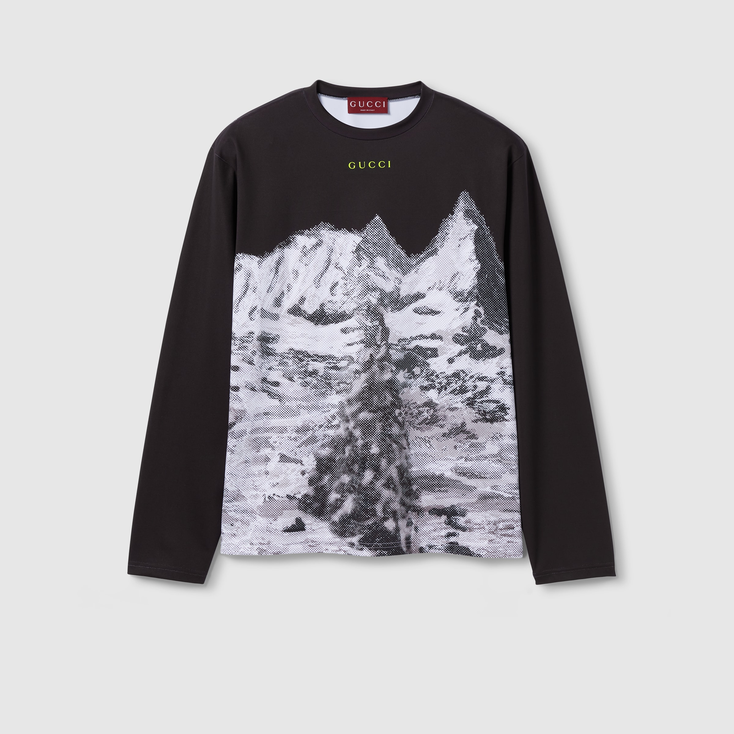 Soft, textured materials define a selection of winter wardrobe pieces, for city or alpine strolls. Crafted from black technical cotton jersey, this long-sleeved T-shirt is decorated with a mountain print and Gucci logo print. - Black technical cotton jersey - Mountain print and Gucci logo print - Crewneck - Long sleeves - Made in Italy