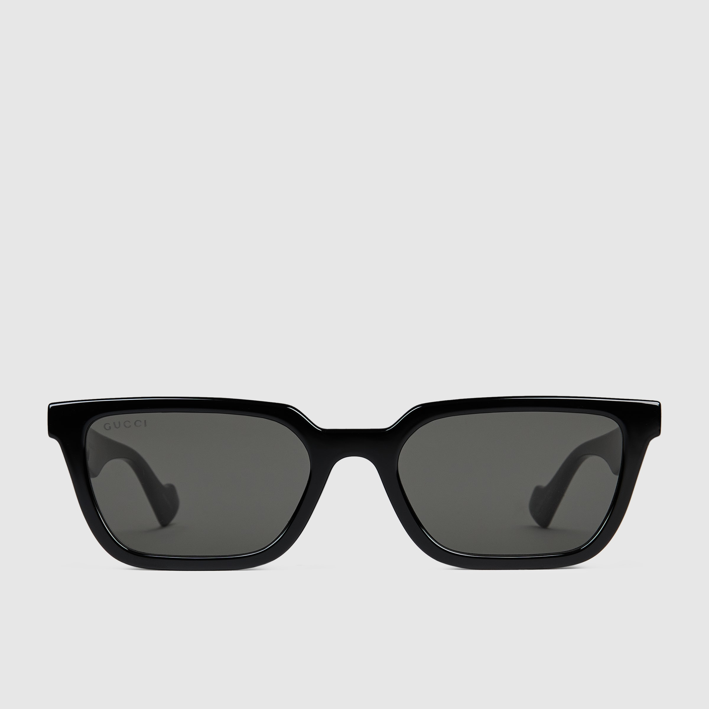 Gucci continues to reimagine everyday accessories in new ways. These rectangular-frame sunglasses are characterized by a black injected frame and temples are further enhanced by the House's logo script. Solid dark grey lenses complete the design. - Black injection frame - Black injection temples with metal gold-toned Gucci engraved detail - Solid dark grey lens - 100% UVA/UVB protection - GG1539S - Temple length: 5.7', lens height: 1.4', nose bridge length: .07' - Frame height: 1.6"; Frame width: 5.7" - Made in Italy - The glasses will arrive in a velvet case, available in a range of six jewel-toned colors, and paired with a coordinating satin lining. The case color will be individually selected for each pair of glasses, and comes with a matching satin flannel pouch and ivory microfiber cloth.