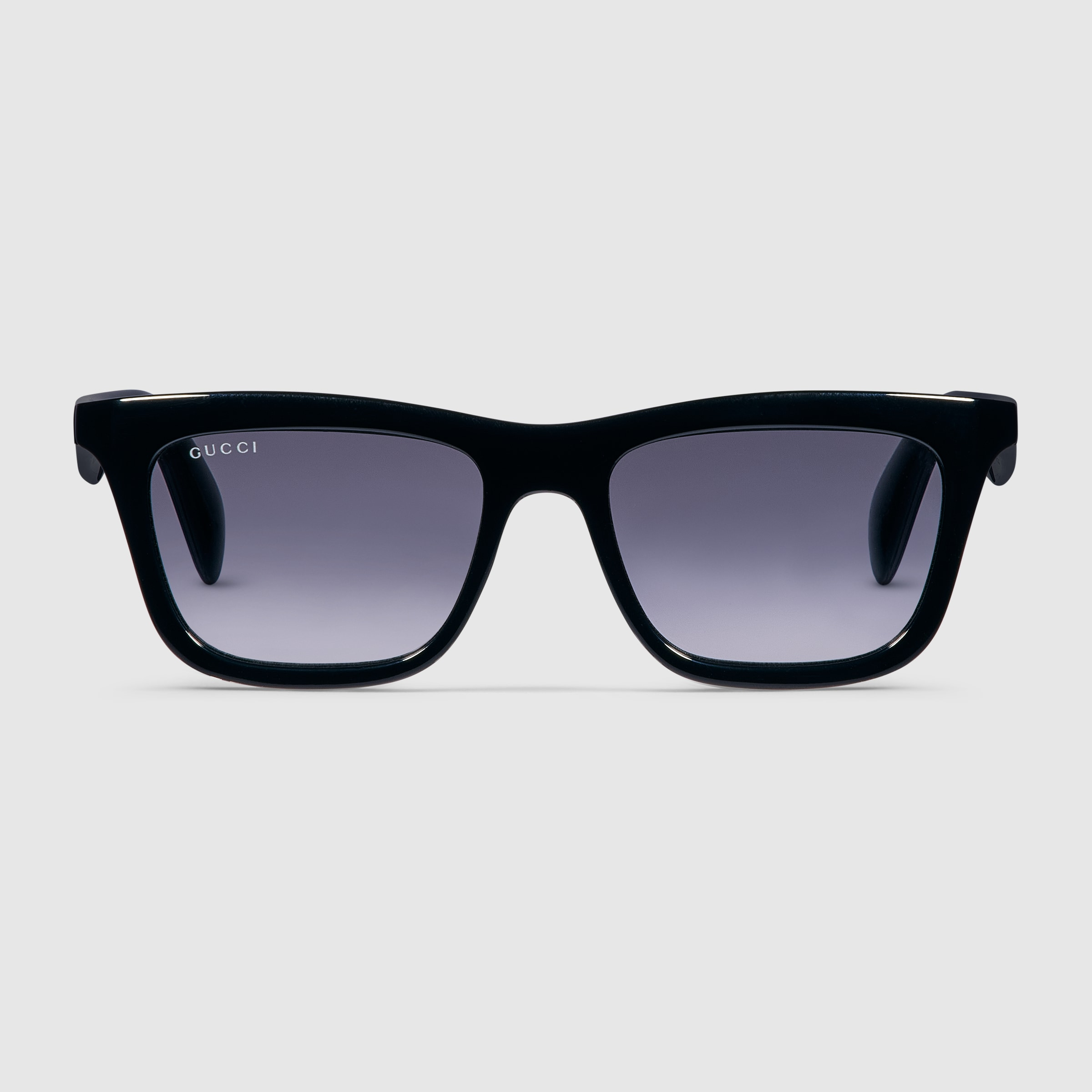 The Pre-Fall 2025 eyewear collection blends statement silhouettes from the archives with a contemporary touch. These rectangular frame sunglasses feature a gradient dark grey lens and a subtle Gucci logo across the temples. - Shiny black acetate frames - Shiny black acetate temples with Gucci logo - Gradient dark grey lens - 100% UVA/UVB protection - GG1933S - Temple length: 5.7"; Lens height: 1.4"; Nose bridge length: 0.7" - Frame height 1.8"; Frame width 5.6"; Hinge to hinge 5.1" - Made in Italy - The eyewear case in the House’s signature Rosso Ancora red hue is complete with a magnetic closure and white interior.